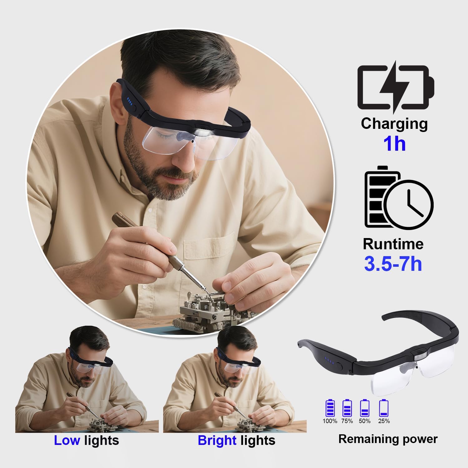 3. Efficient Rechargeable Power Solution Our hands-free magnifier features a long-lasting lithium battery providing 4-7 hours of continuous use on a single charge. The USB-C charging system (cable included) delivers a full charge in just 1.5 hours from any standard USB power source. Eliminate disposable battery costs while enjoying consistent, bright illumination for all detailed work – a truly economical and eco-friendly solution.