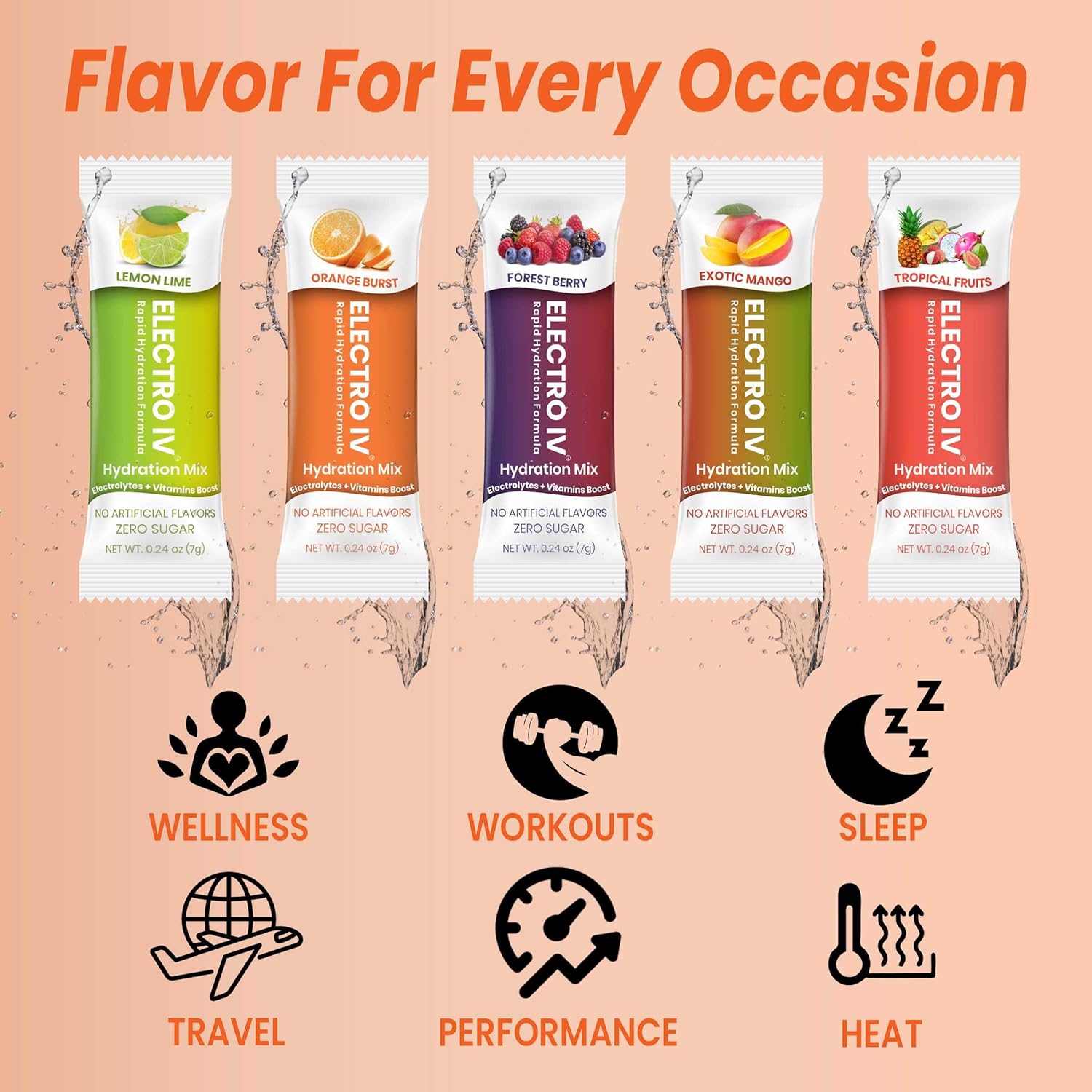 DELICIOUS FLAVORS FOR EVERY TASTE: Choose from Exotic Mango hydration, Orange Burst hydration, Tropical Fruits hydration, Forest Berry hydration, and Lemon Lime hydration — all in convenient hydration sticks or electrolyte drink packets.