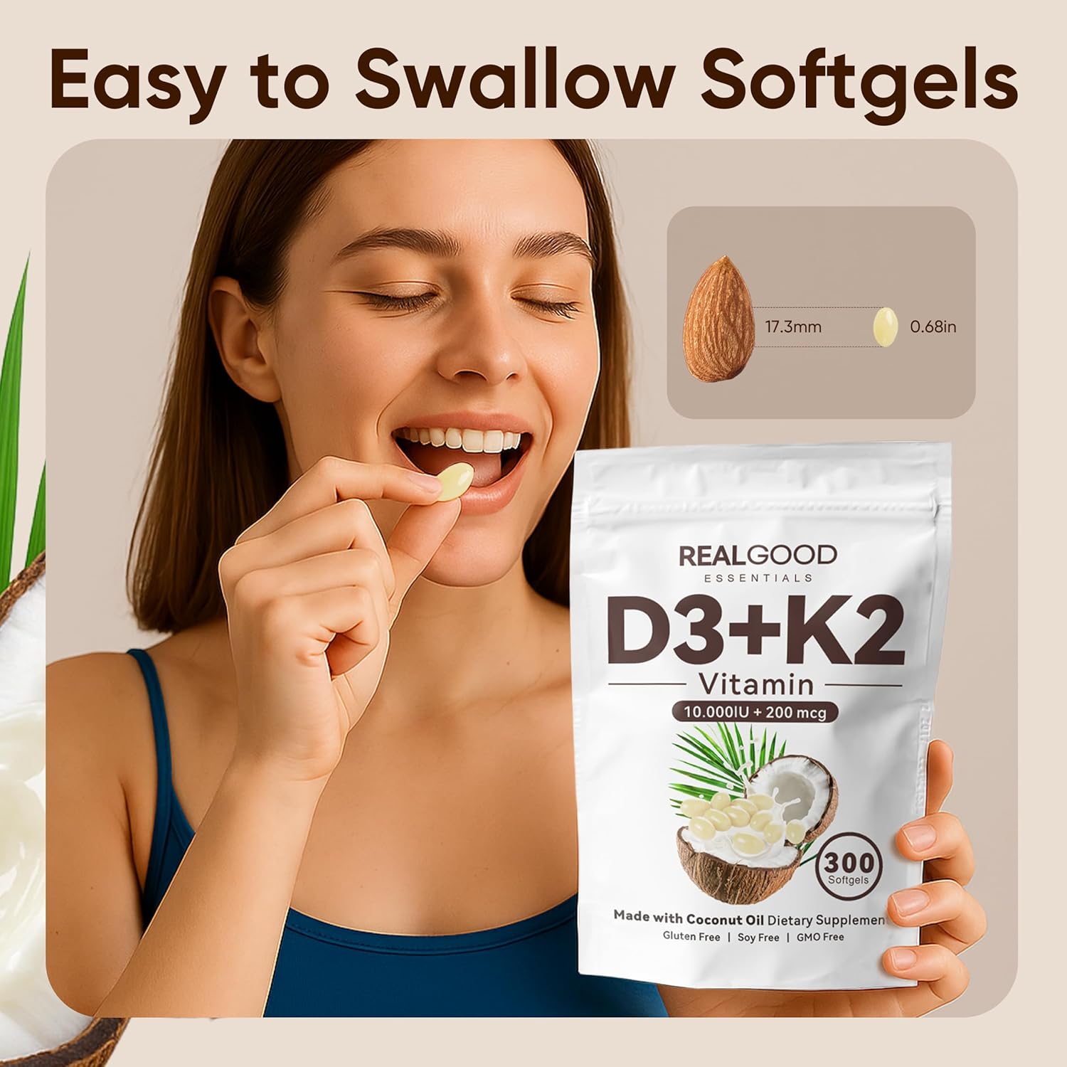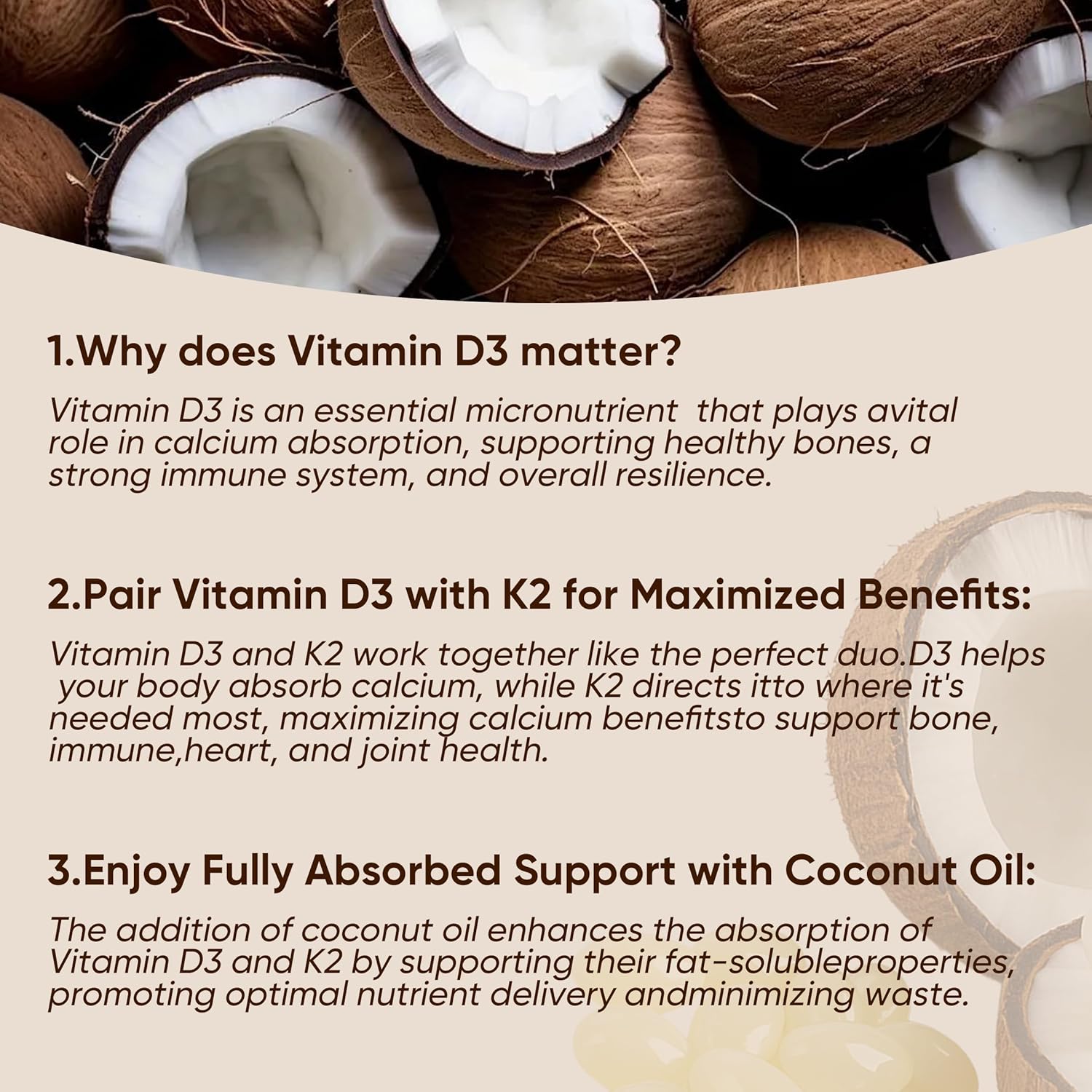 【High-Quality Coconut Oil】Vitamins D3 and K2 are fat-soluble, each softgel includes coconut oil (MCTs), Healthy Coconut Oil enhanced nutrient absorption
