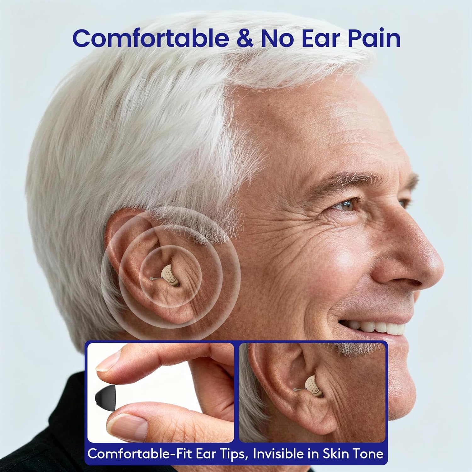 All-Day Stable & Comfortable Fit:Ergonomically shaped to match the natural curve of your ear canal, these hearing aids are made from medical-grade silicone for a secure, slip-free fit. Lightweight at only 2g, they stay comfortable all day without causing pressure.