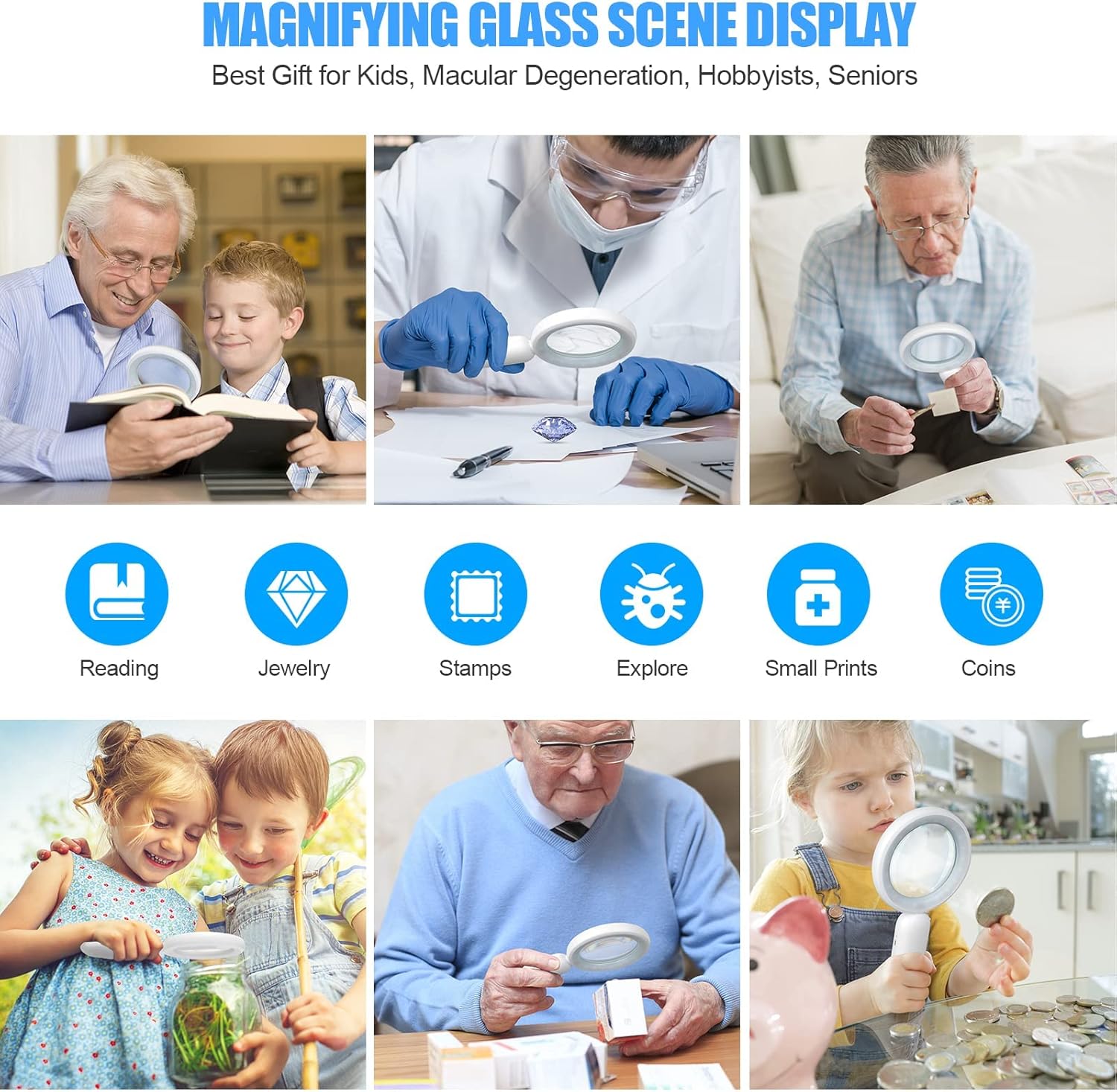 Widely Application: This magnifying glass has a wide range of uses. For the elderly to read books, newspaper, maps, photos or micro prints on pill bottles or labels, for coin collectors to check details, jewelers to check jewelry, for kids to explore the plants and animals of nature.