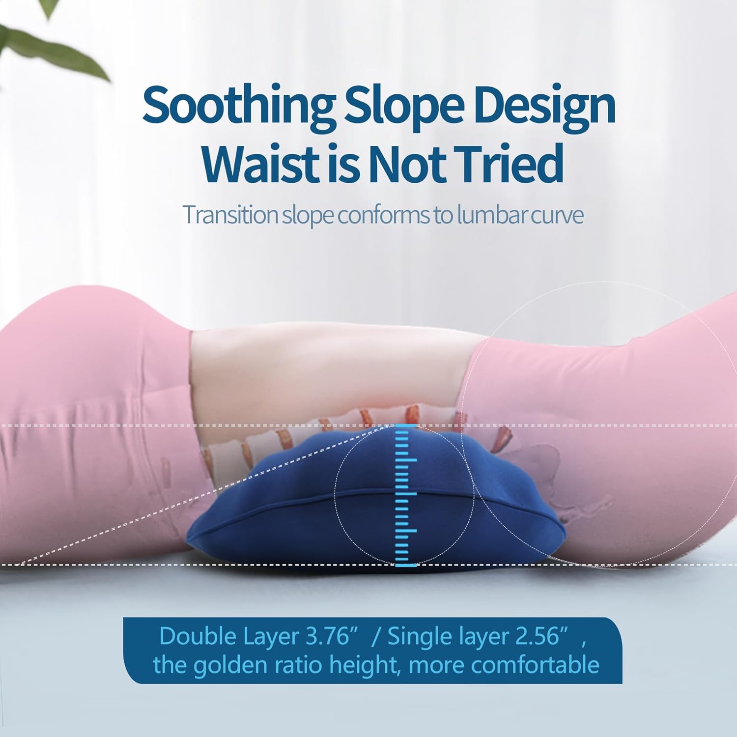 Height Adjustable lumbar back support pillow for sleeping. A removable cushion to adjust the height. With cushion, the height is 2.56 inches, which makes it be a lumbar stretcher. Lay on it half an hour, lower back pain relief and tension release. Without cushion, the height is 1.38 inches. Sleeping on it, keeps a healthy curvature all night.