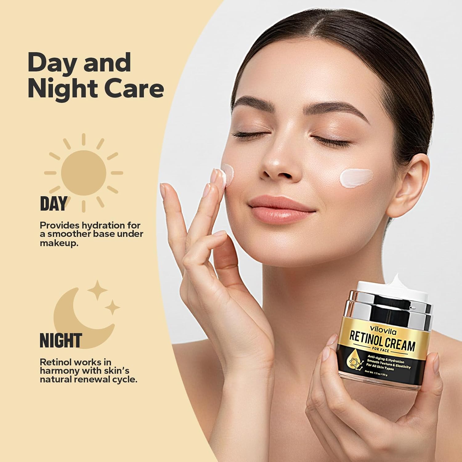 Day & Night Care: This Retinol Cream is versatile enough for both morning and evening skincare routines. In the morning, it provides hydration for a smoother base under makeup, while at night, retinol works in harmony with your skin’s natural renewal cycle. The balanced formula offers hydration, nourishment, and anti-aging support throughout the day and night, making it a simple and effective addition to your daily skincare regimen.