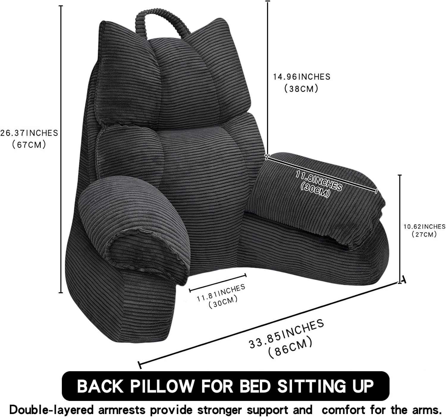 Bed Pillows for Sitting Up in Bed –This large-sized reading pillow measures 26.37 inches in height and 33.85 inches in width. It features a double-layer armrest design, with each armrest measuring 11.81 inches long and 10.62 inches high, providing more stable support for your arms and making reading, binge-watching, or relaxing more comfortable. It weighs approximately 6.83 pounds and is both sturdy and comfortable