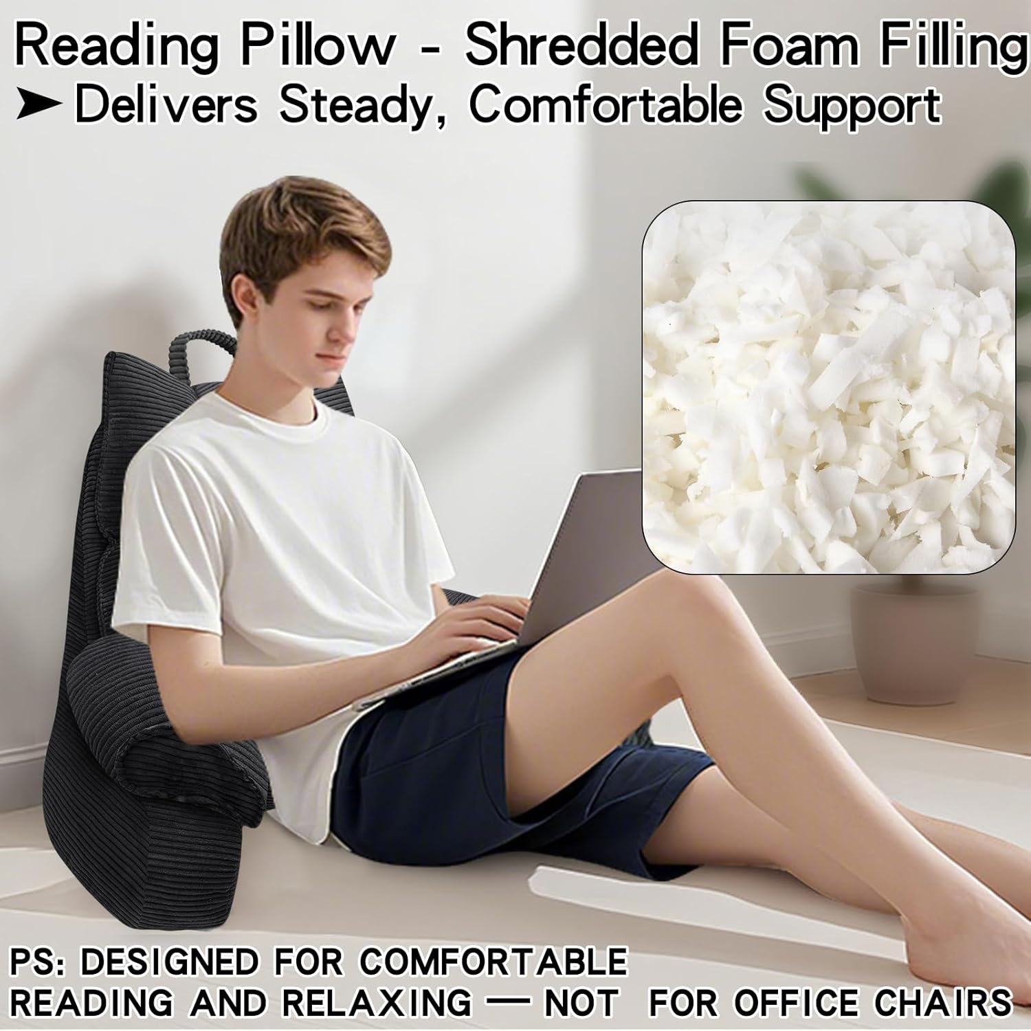 Our reading pillow :removable and washable, filled with shredded memory foam. To accommodate different comfort preferences, we have added extra foam. If the backrest pillow feels too large, too tall, or too firm, simply unzip the bottom zipper, remove some filling, and gently pat the back to adjust the height and firmness for a more comfortable experience