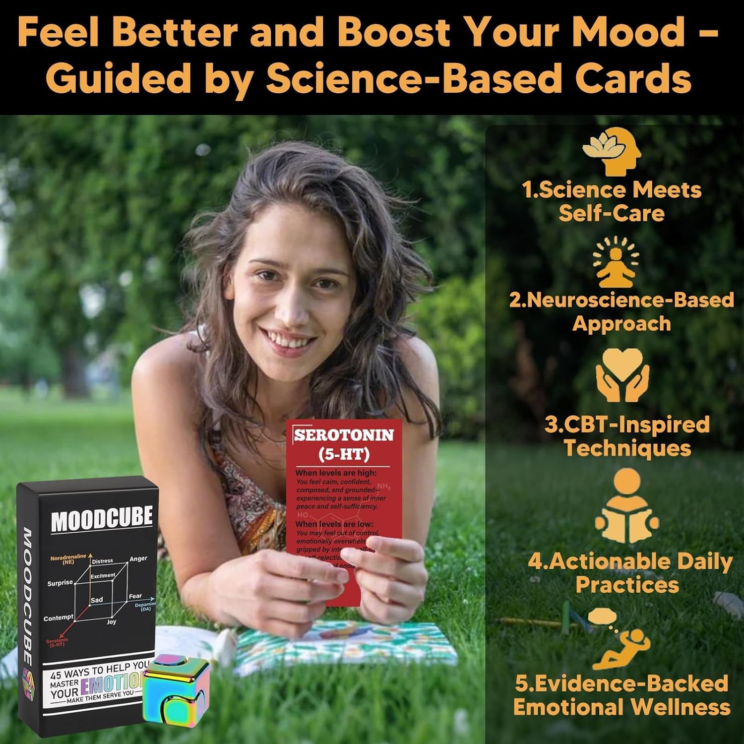 Anxiety Relief Kit: Balanced levels of dopamine, norepinephrine, and serotonin are key to emotional stability, motivation, and mental health. Our neuroscience-based stress relief cards and fidget cube-inspired MoodCube turn brain science into 45 simple daily practices, helping you feel calmer, stay focused, and genuinely happier