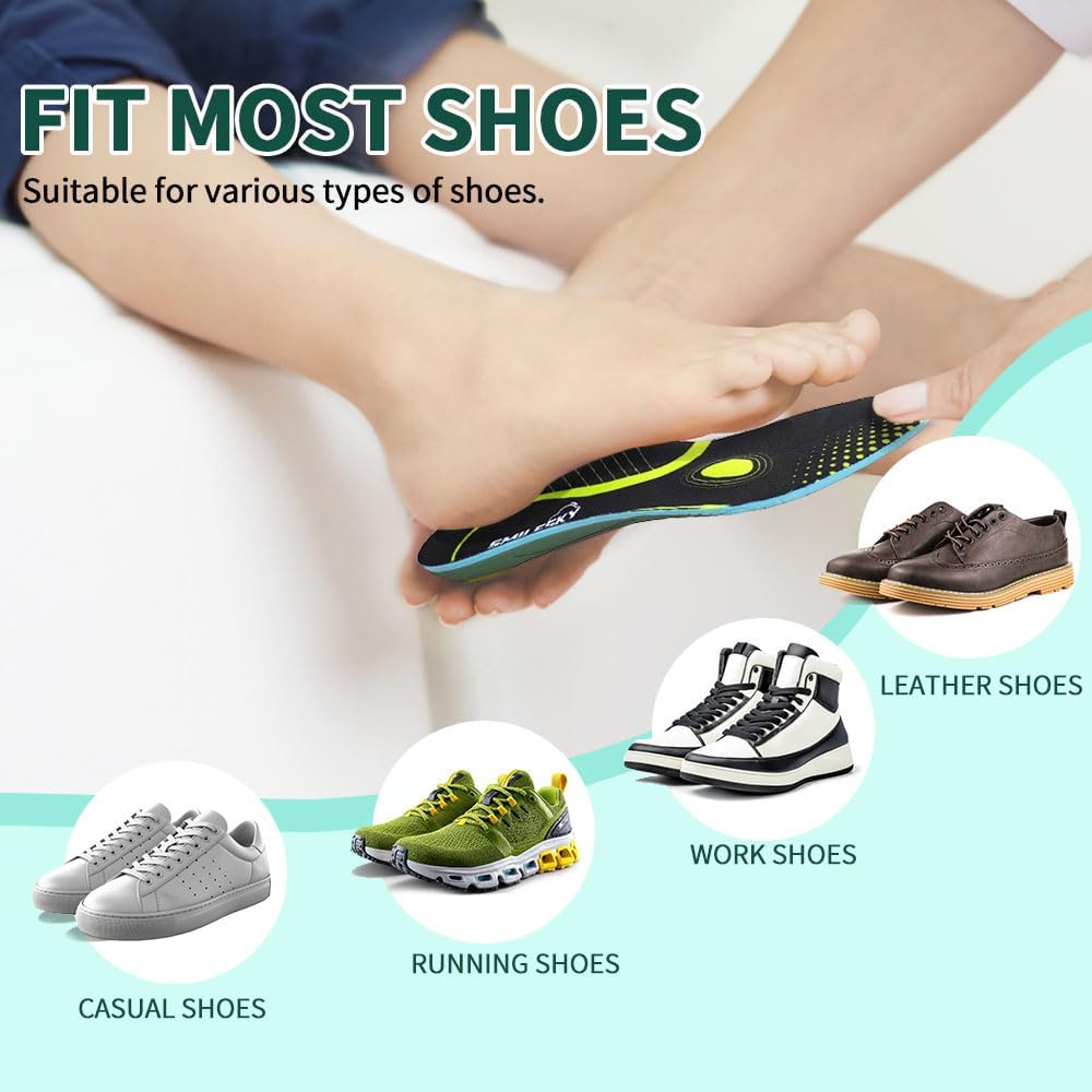 【Built for Demanding Work & All-Day Comfort】 Engineered specifically as work boot insoles for men&women, these shoe inserts for men deliver unmatched support and cushioning. The deep heel cup and targeted arch support lock in your foot, while the high-density foam and shock-absorbing layers provide superior cushion insoles men need for hard surfaces. The moisture-wicking top fabric keeps feet dry, making these the best insoles for standing all day in work boots or casual shoes. From boot insoles to mens insoles for sneakers, this is the ultimate shoe insert for lasting comfort.