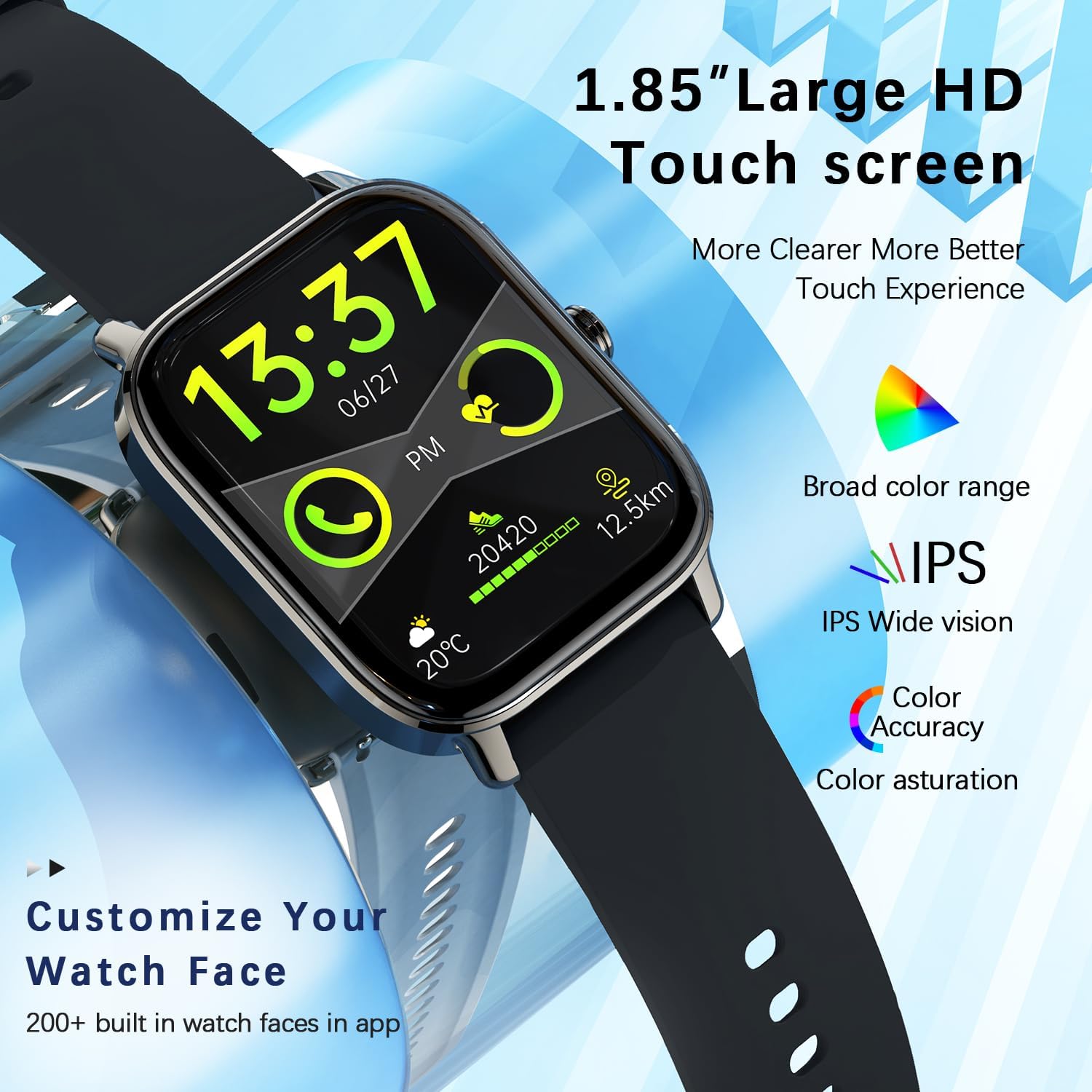 1.85-inch Touch Screen & Customizable Dials: The ios android smart watch is equipped with 1.85-inch HD touch screen, significantly improving color quality and touch responsiveness, allowing for easy navigation through its various features. Smart watch for android phones come with up to 100 dial options available in the app, you can even personalize your watch face using your favorite photo.Smart watch for iphone compatible come with 2 watch straps of different colors