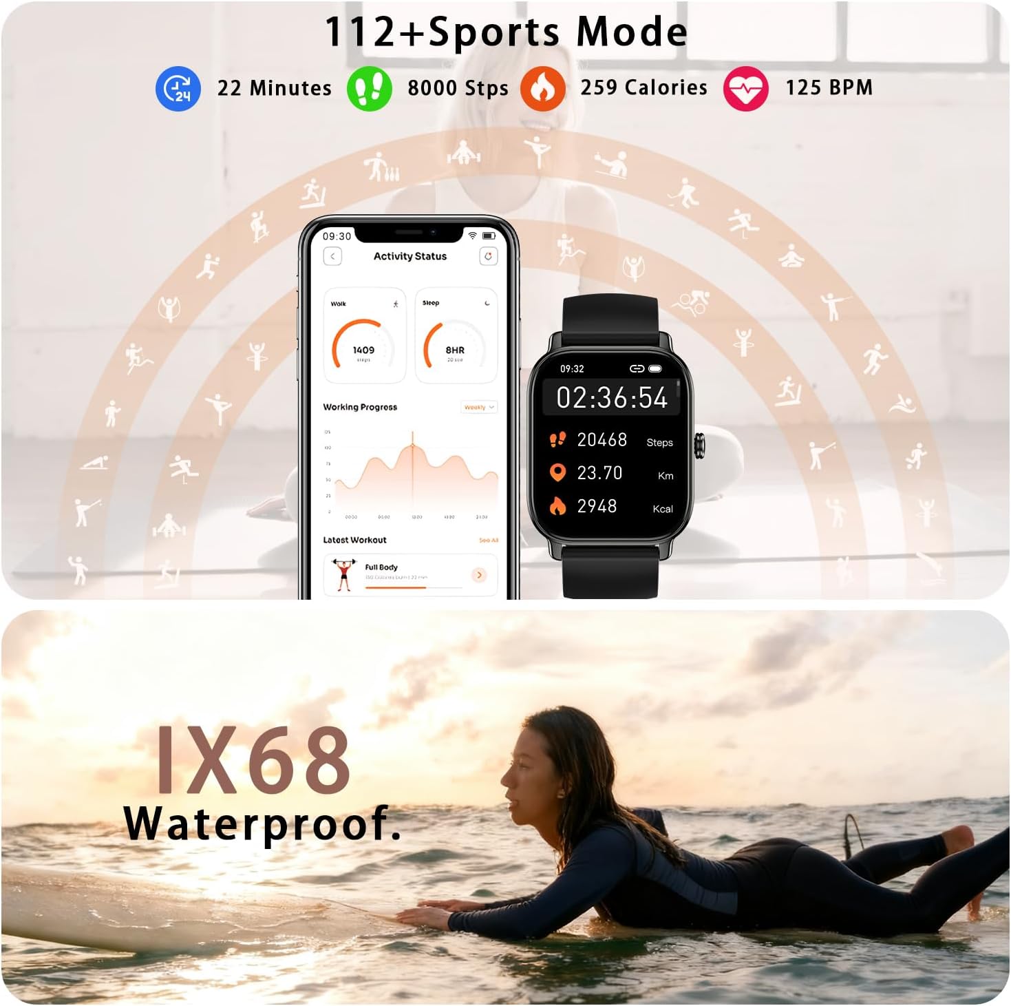 24-Hour healthy activity Tracker: Health watches for men women equipped with advanced sensors, the sports watch accurately tracks your dynamic/static heart rate, blood oxygen (Sp02) and blood pressure, helping you better understand your health and make informed lifestyle adjustments.Heart rate monitor watch also automatically monitors your sleep patterns, providing a comprehensive analysis of your sleep quality—including deep sleep, light sleep, awakening