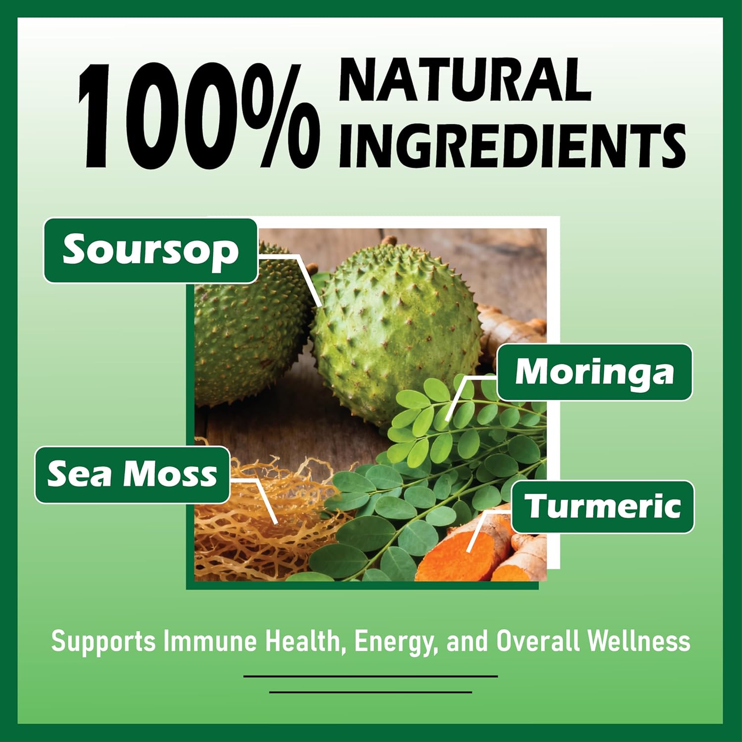 Powerful 10-in-1 herbal blend with Soursop, Sea Moss, Moringa & Turmeric supports immune health, energy, and overall wellness—naturally.