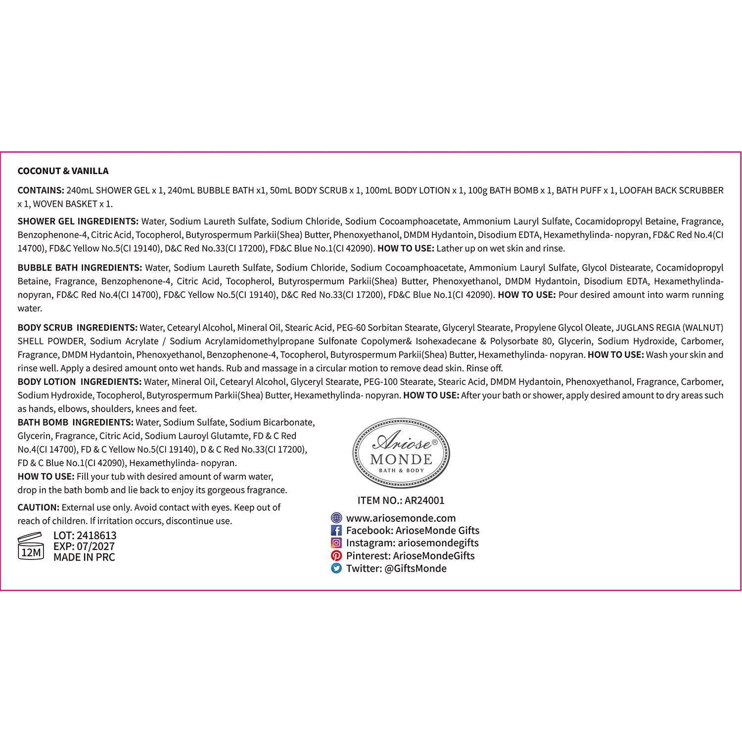 THE PERFECT GIFT FOR ANY OCCASION: This Coconut Vanilla Bath Gift Set is the perfect gift for birthdays, holidays, Christmas, Mother’s Day, Valentine’s Day, wedding anniversaries and more. Its luxurious and pampering products make it a thoughtful and versatile gift option
