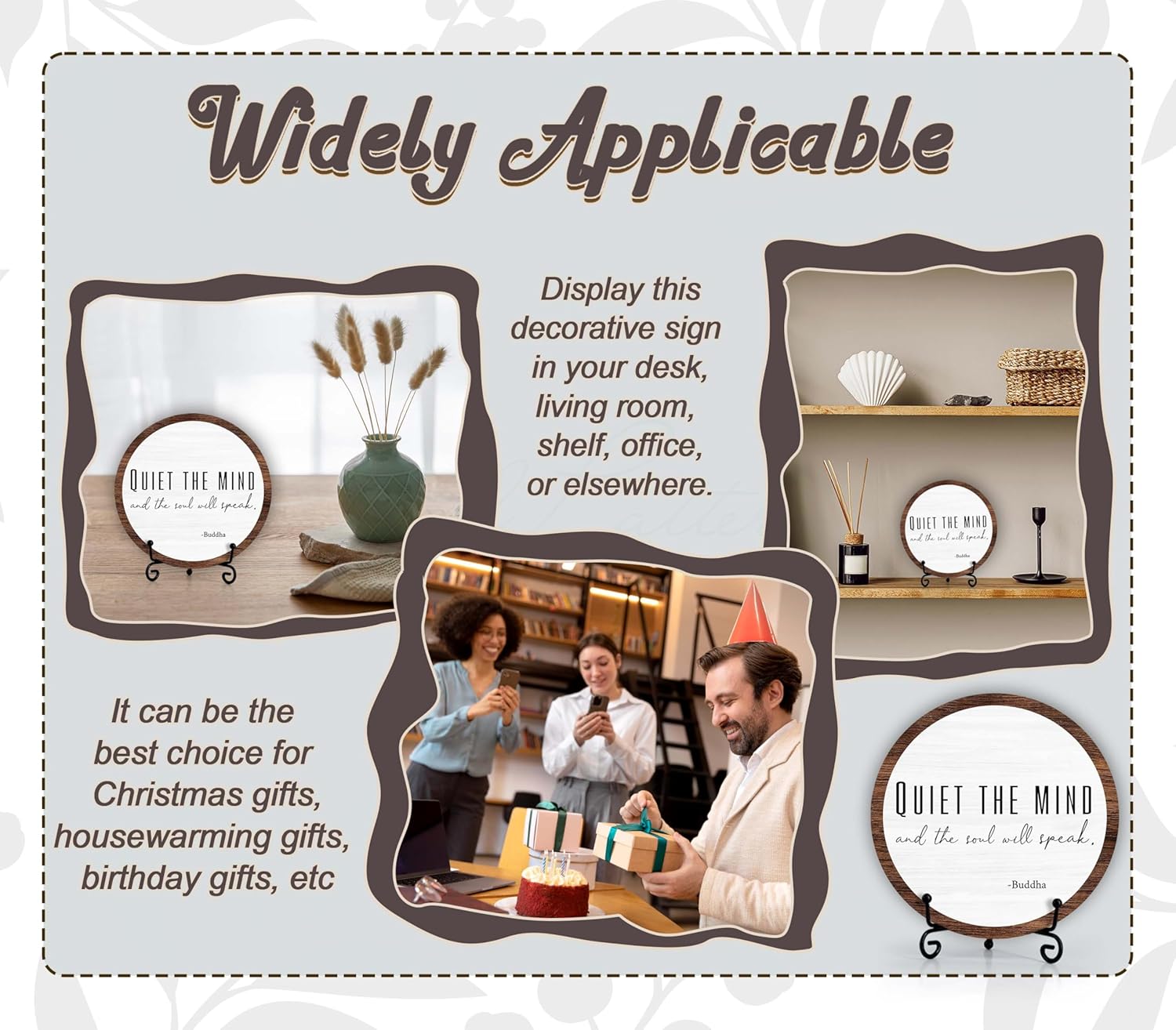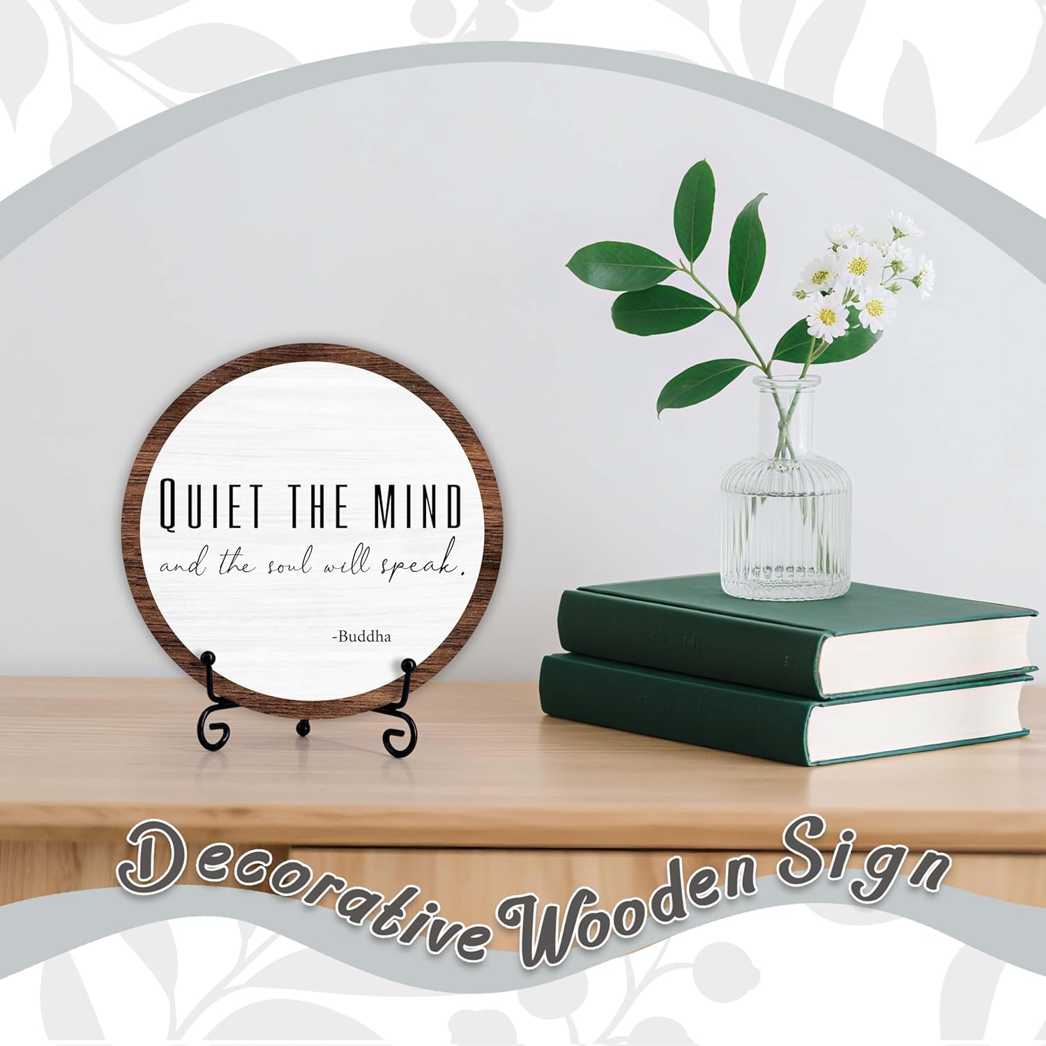 Dimensions: 6 x Wooden Sign Material: This wooden sign is made of solid wood, sturdy and durable, whether you want to add a durable sign to your desktop or just want to buy a sign made of high-quality materials, this sign is your perfect choice.6 inch round wooden sign with iron stand.