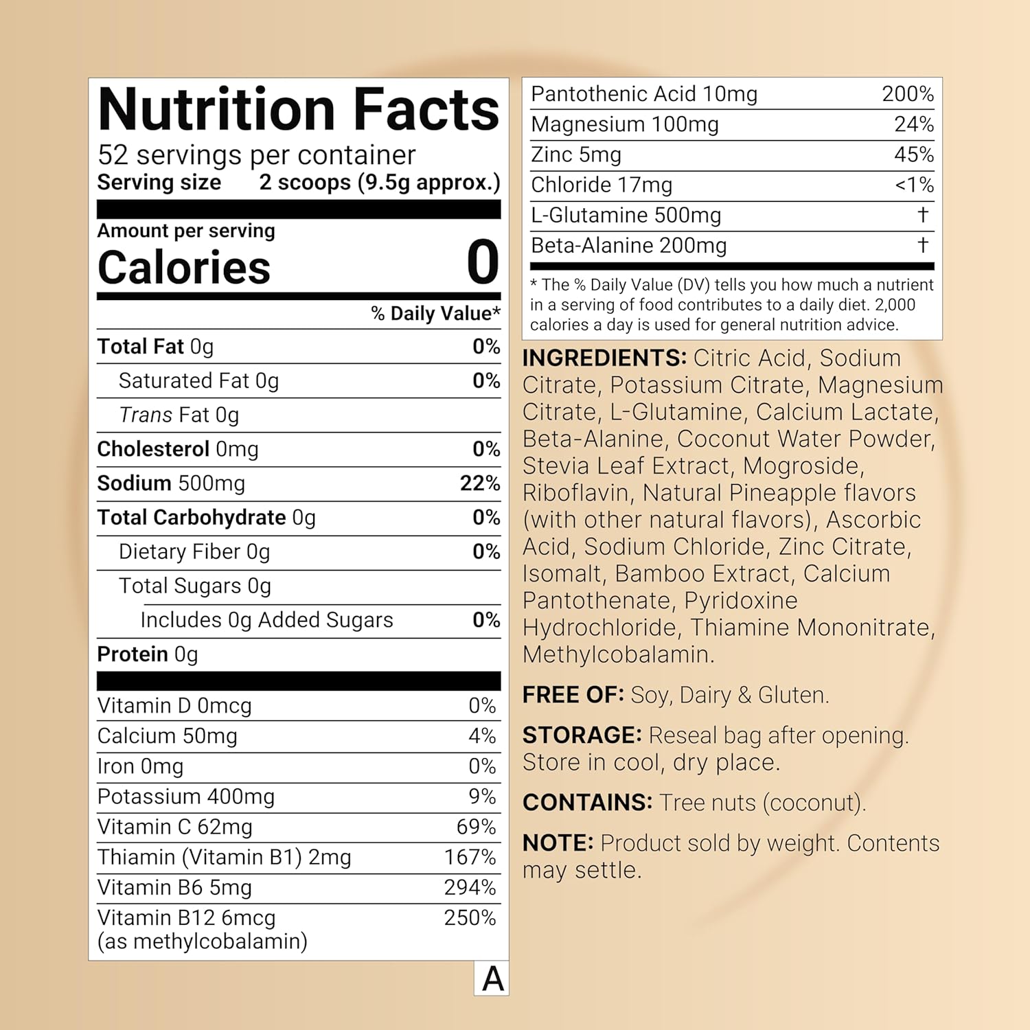 Each jar provides 500g (1.1 lbs) of powder, delivering a balanced hydration profile with 500mg Sodium, 400mg Potassium, 100mg Magnesium, 500mg L-Glutamine, and 200mg Beta-Alanine, plus Vitamin B12 (Methylcobalamin), Vitamin C, Thiamin, Vitamin B6, Zinc, and Pantothenic Acid.