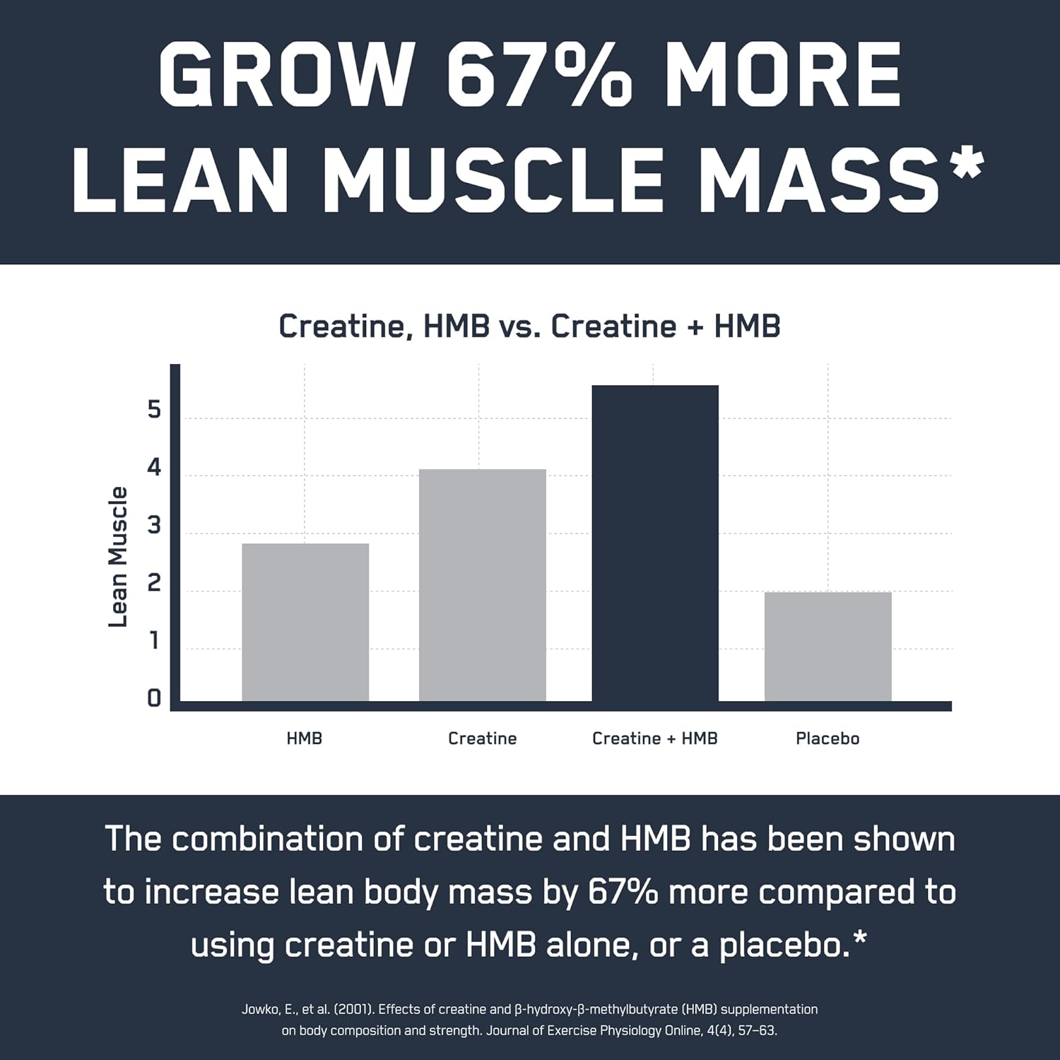 Push Harder & Recover Faster: Research shows the powerhouse combination of creatine and HMB while resistance training has been shown to additively increase lean body mass and strength up to 67% more effectively than with creatine or HMB alone.*