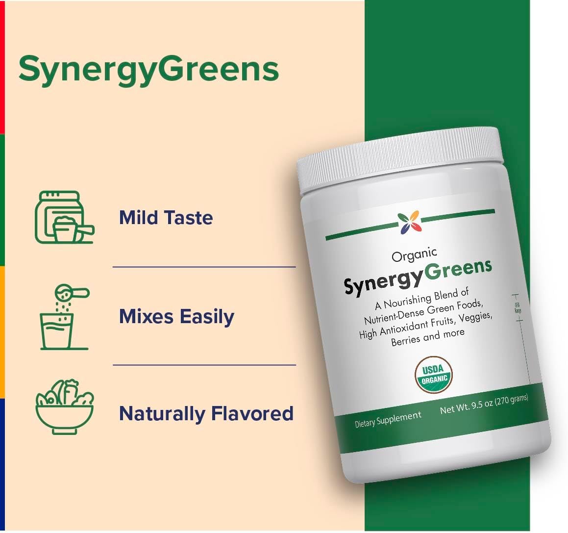 Organic SynergyGreens is a wholesome, concentrated drink mix featuring 24 certified organic greens, vegetables, fruits, and berries. Naturally flavored and easy to add to your favorite beverages, each serving provides a nurturing blend of antioxidants, phytonutrients, vitamins, and minerals.