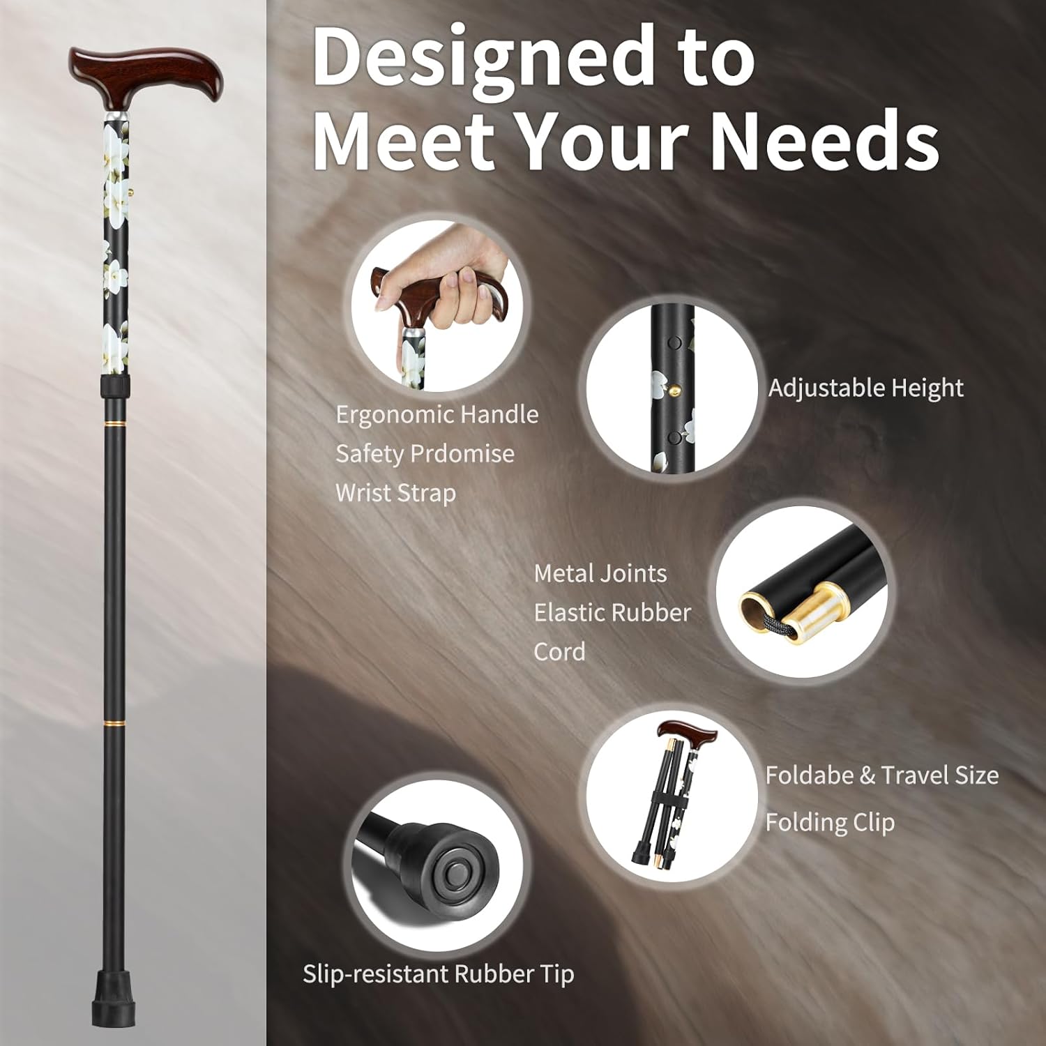 Adjustable cane combines comfort and fashion, enhancing mobility Available in multiple colors, combining practicality and fashion. The comfortable wooden handle and sturdy structure provide stability for daily activities. Lightweight yet sturdy, it is the ideal choice for users who pursue convenience and durability