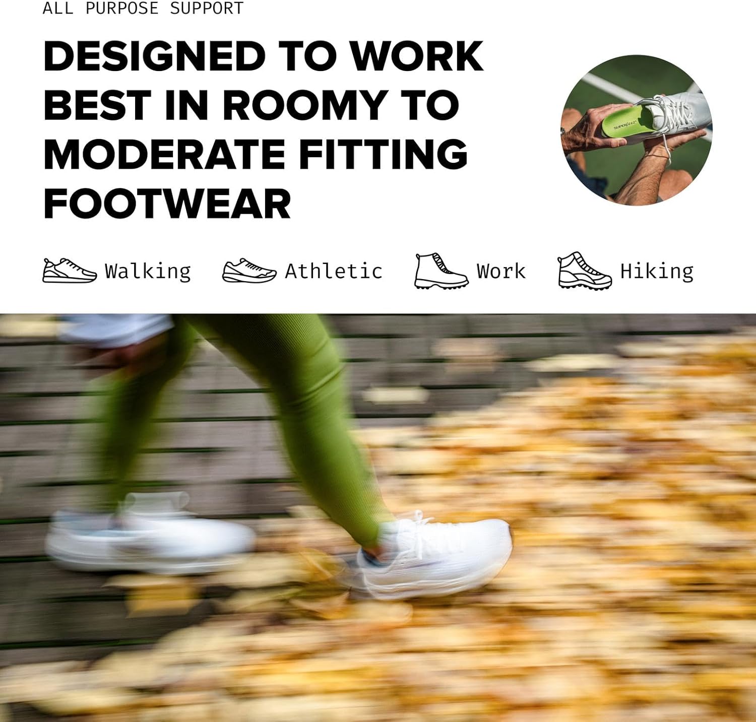 Premium Arch Support Insoles: Sculpted heel cup cradles the heel to maximize natural shock absorption; designed for roomy footwear.