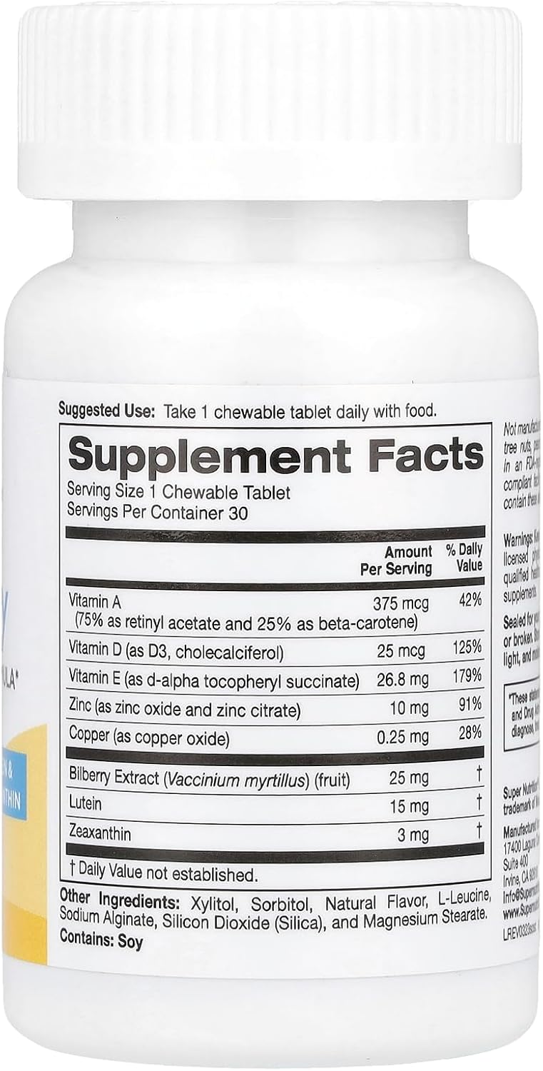 Essential nutrients to support eye health including 15 mg of lutein, 3 mg zeaxanthin and 25 mg bilberry extract all in one chewable per day.