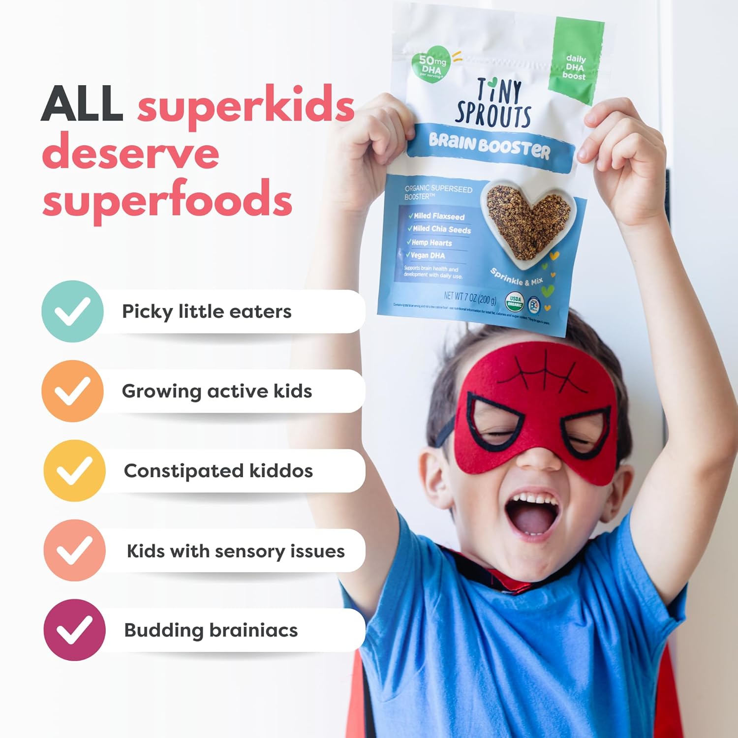 BRAIN BOOSTER: Give your little one the ultimate brain boost with our unique Flax, Chia & Hemp Organic Superseed Blend with vegan omega-3 DHA.This is a go-to for oatmeal, smoothies and yogurt and great for those new to seeds. Plus these seeds are easy to disguise!