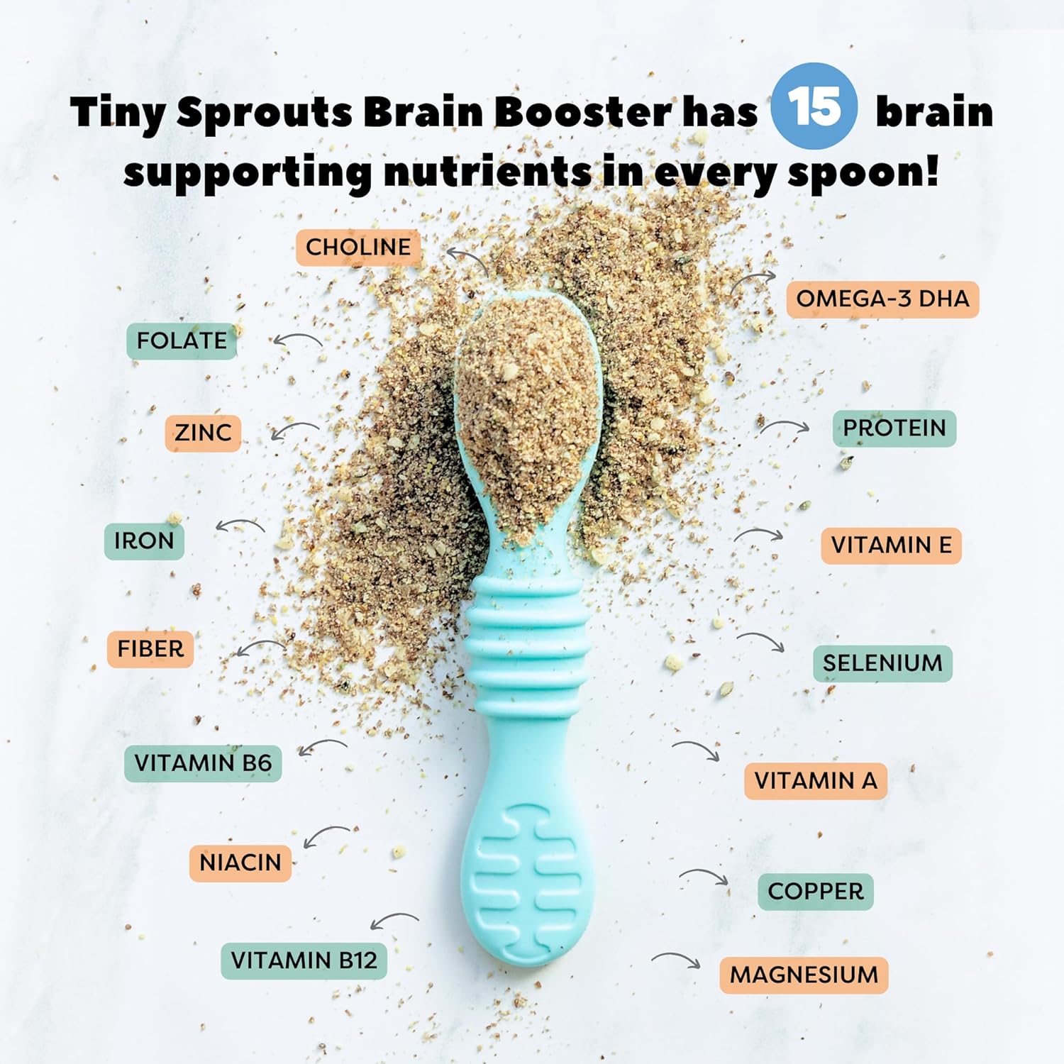 SUPPORT GUT-BRAIN AXIS: An excellent source of omega 3 ALA & DHA, protein, iron and prebiotic fiber to support the gut brain axis, Tiny Sprouts Brain Booster is an easy way to nourish budding brainiacs! Simply add to any food or beverage for a daily boost of 13 brain supporting nutrients.