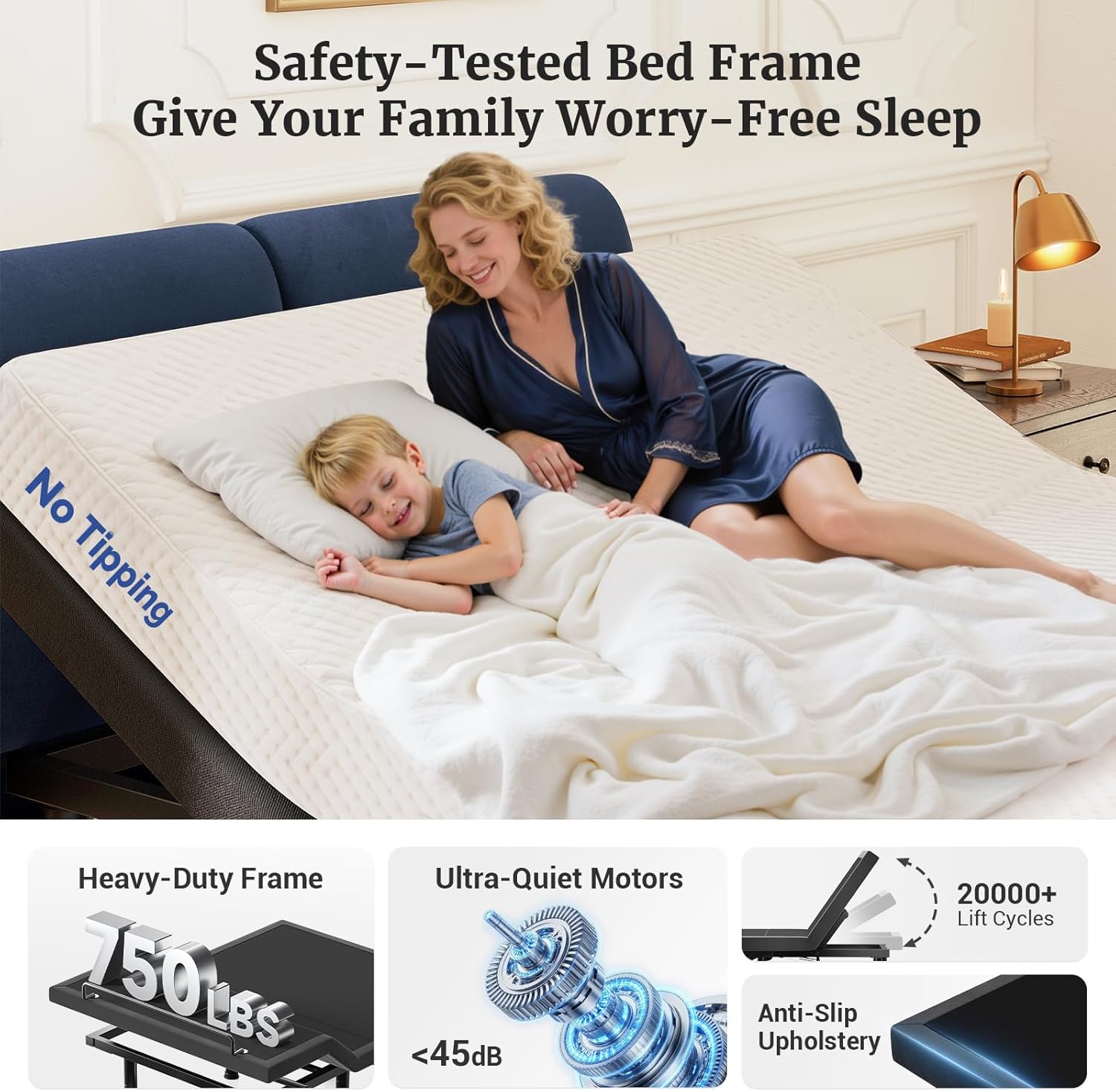 【Premium Durability】High-strength steel frame supports up to 750 lbs. Anti-tip design for optimal stability. Tested for 20,000 lift cycles—2 times the industry standard—for lasting durability. Whisper-quiet motor ensures smooth adjustments. With less than 45 decibels of noise, give your family a peaceful night.