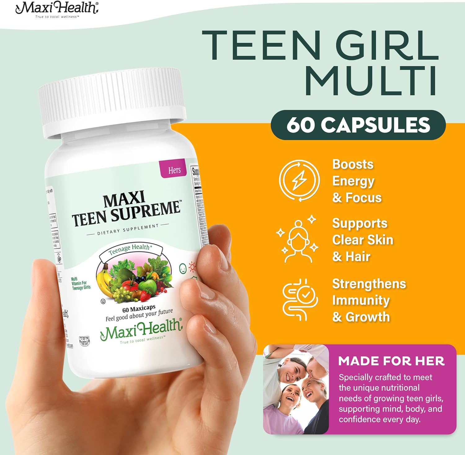TEEN GIRL MULTIVITAMIN – A specially formulated multivitamin for women ages 12–17, featuring 32 essential nutrients to support teen body and brain growth. The ideal step between vitamins for kids and adult multivitamins.