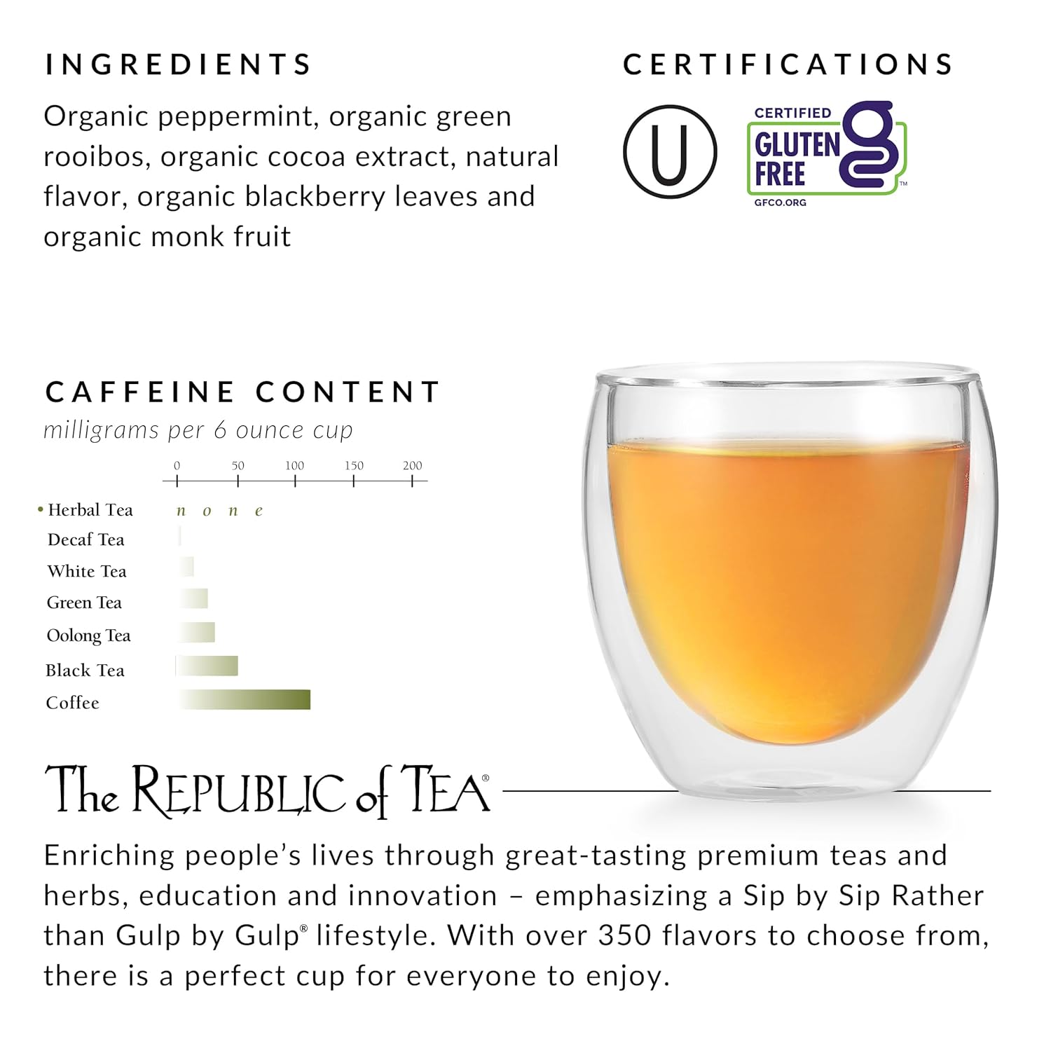 INGREDIENTS: Organic Peppermint, organic great rooibos, organic cocoa extract, natural vanilla flavor, organic blackberry leaf and organic monk fruit