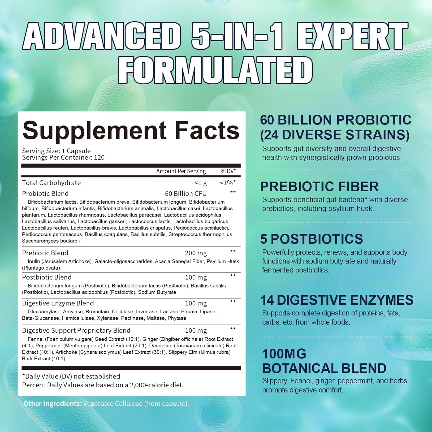 5-in-1 Full-Spectrum Pro Post Probiotics: Unlike other brands, our daily colon health supplement delivers powerful synergy by combining probiotics, prebiotics, postbiotics and – especially – digestive enzymes and expertly crafted digestive herbs. Whole-food prebiotic fibers like Inulin and Acacia Senegal help promote the growth of good bacteria*. Together, these ingredients create an all-in-one solution for gut balance, digestive comfort, and immune support—meticulously curated for its proven properties for daily balance and comfort.