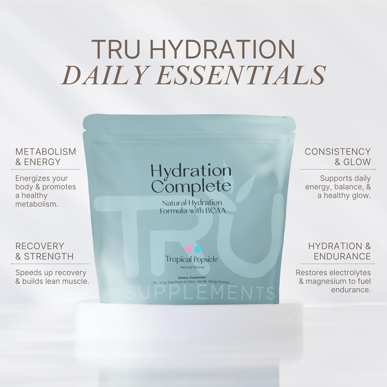 TRU HYDRATION COMPLETE contains 1250 mg of the amino acid L-Carnitine paired with our perfect ratio of L-Leucine, L-Isoleucine, and L-Valine combo that gives you all the benefits that you expect from your BCAA regimen.