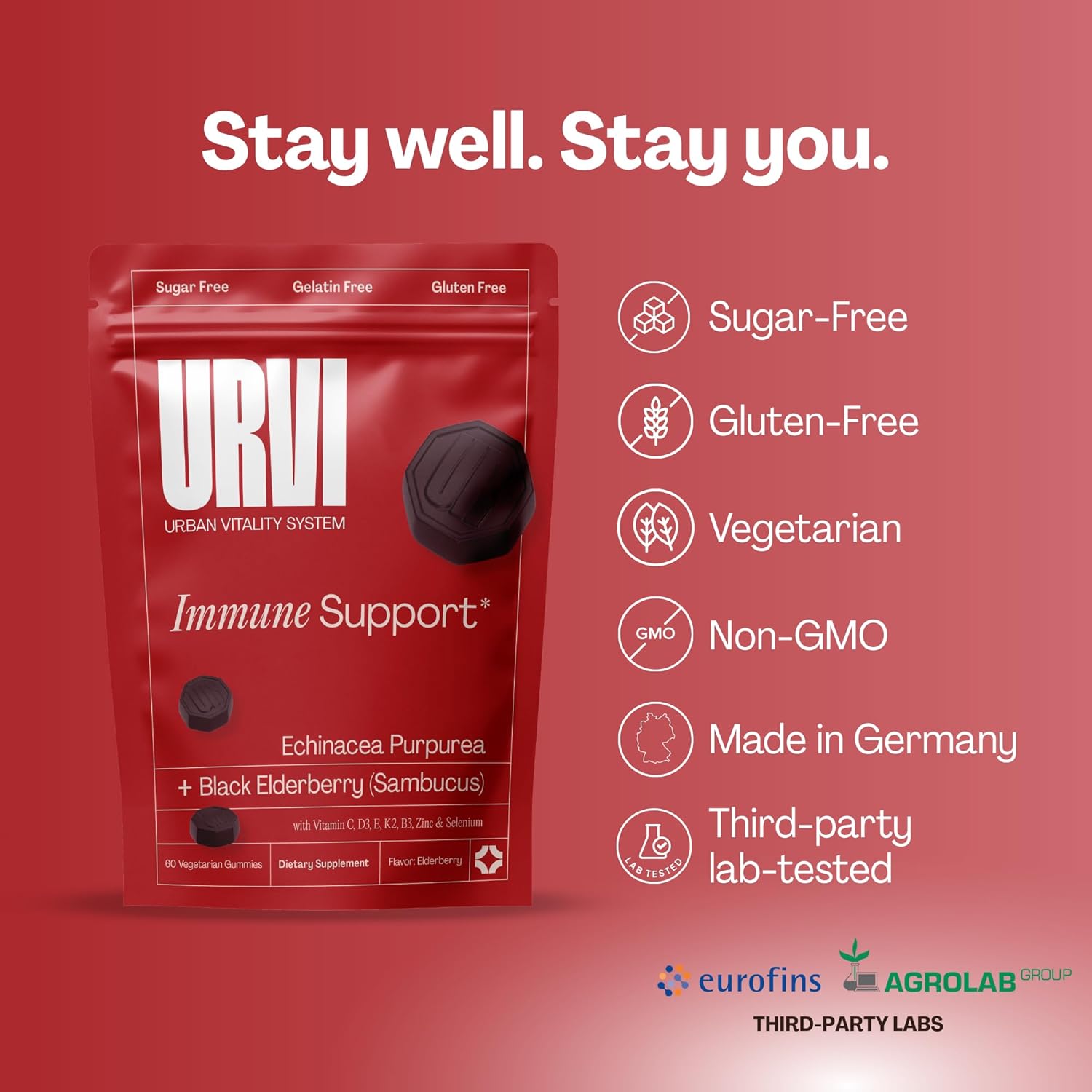 CLEAN, MODERN GUMMY FORMULA: Sugar-free, gluten-free, vegetarian, and non-GMO, with no artificial colors or flavors. Easy-to-chew elderberry-flavored gummies that fit seamlessly into busy routines — at home, at work, or on the go.