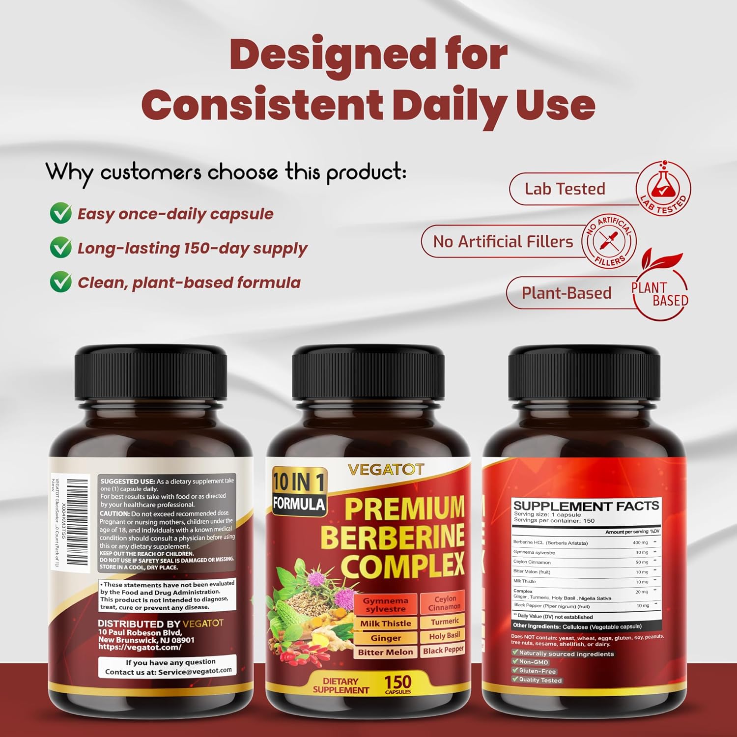 HIGHEST POTENCY: Vegatot GlucoSavior Berberine supplement contains a blend of 10 premium herbs, which work together to promote both heart-wellness and gastrointestinal function. Moreover, each capsule is packed with a highly concentrated herbal blend to ensure maximum benefits. With Vegatot GlucoSavior Berberine, you can save time and effort as it provides all the necessary nutritional support you need in just two capsules per day.