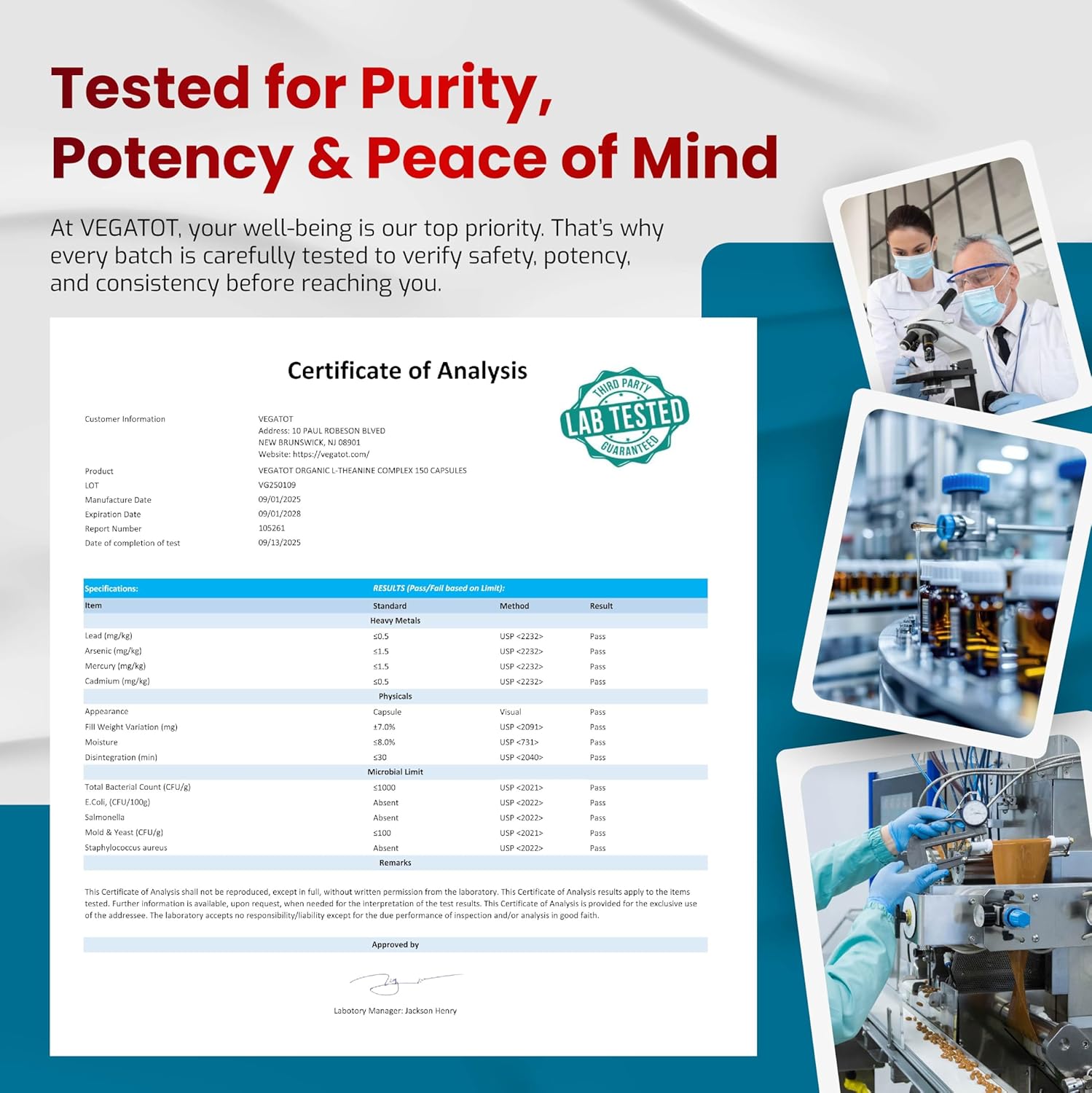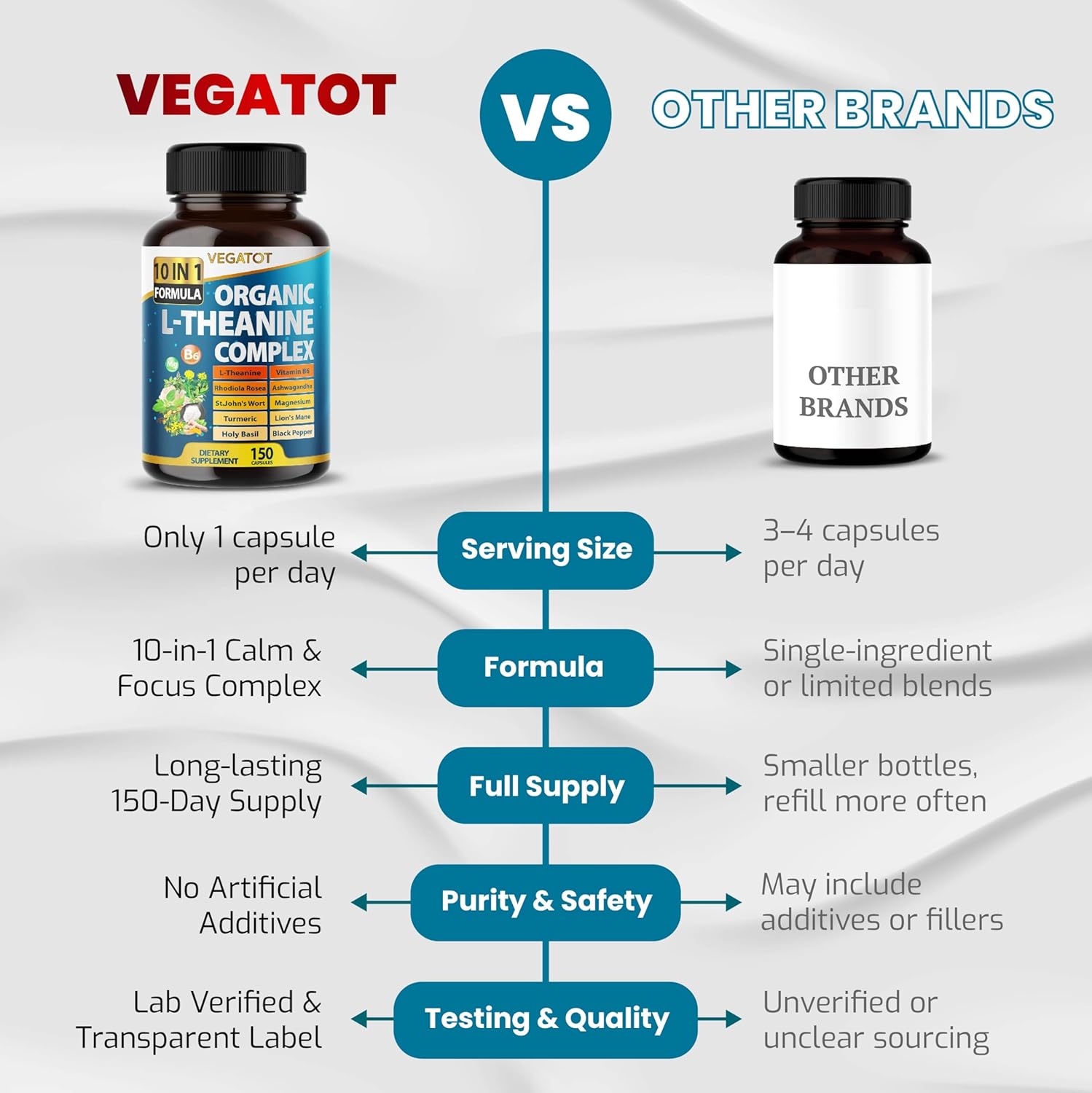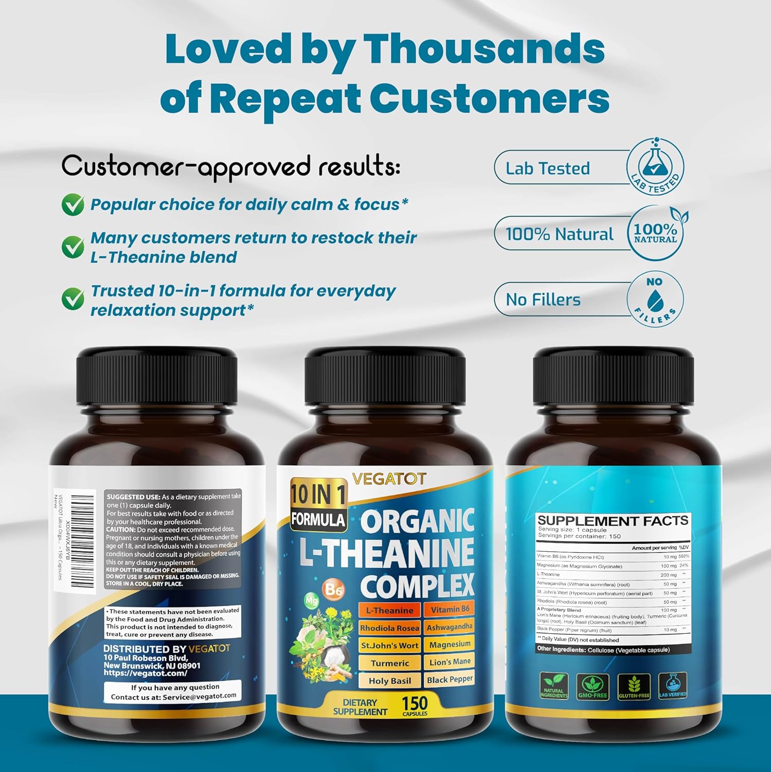 Busy schedules, constant notifications and late-night screens can make it hard to relax and switch off. VEGATOT Organic L-Theanine Complex is a 10-in-1 formula designed to help support calm mood, healthy stress response and an easier evening wind-down as part of a balanced lifestyle.* Each once-daily capsule provides L-Theanine, Magnesium and Vitamin B6 to support relaxation and nervous-system wellness, plus Ashwagandha, Rhodiola Rosea and St. John’s Wort for additional mood and stress support.* A complementary blend of Lion’s Mane, Holy Basil and Turmeric, rounded out with Black Pepper for absorption, offers herbal and antioxidant support for calm focus and restful nights.* The formula is Non-GMO, gluten free and lab verified, with all ingredients and amounts clearly listed—no proprietary blends or hidden stimulants. With 150 vegetable capsules per bottle and a simple 1-capsule daily serving, it’s easy to keep this calm-support complex in your long-term wellness stack.* *These statements have not been evaluated by the Food and Drug Administration. This product is not intended to diagnose, treat, cure, or prevent any disease.
