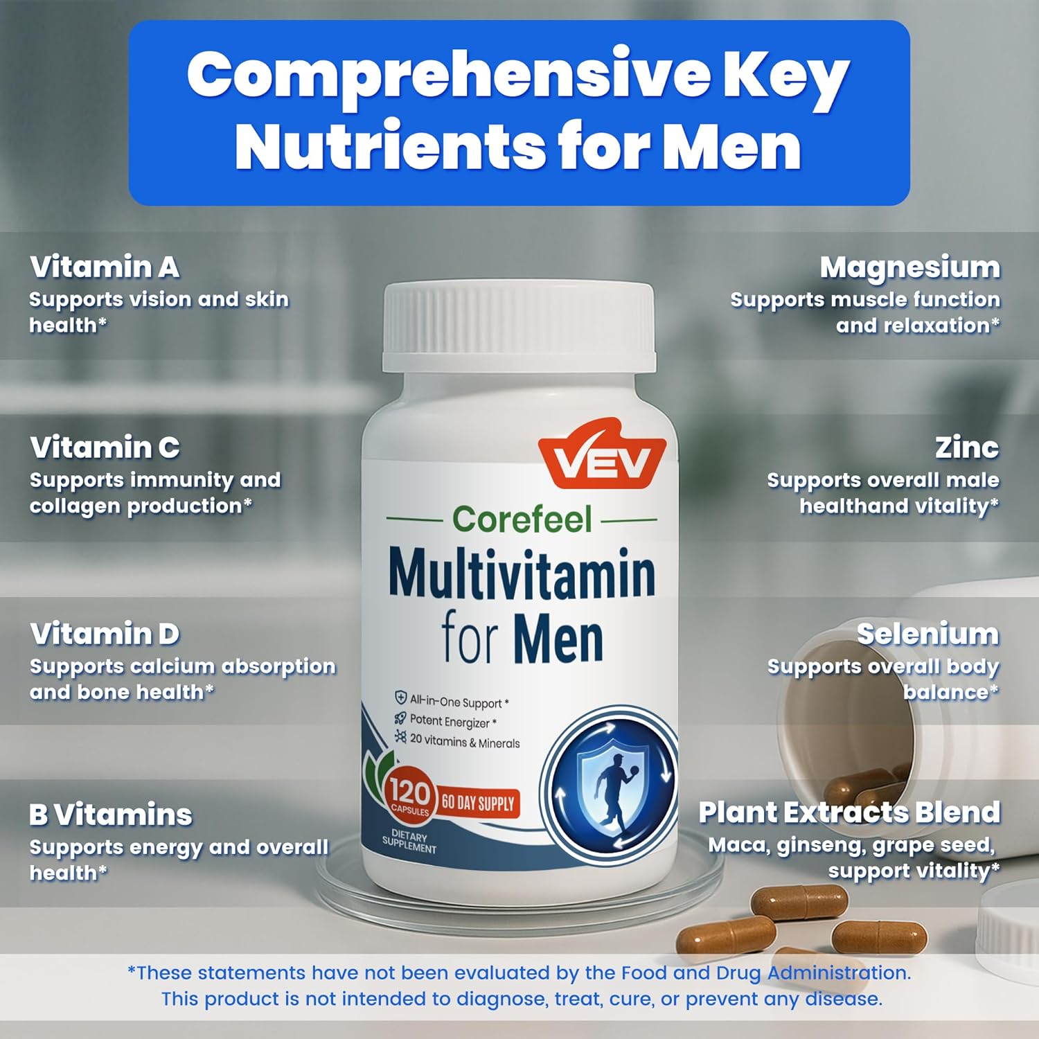 VEV Multivitamin for Men Nutrition Formula: Formulated with 13 essential vitamins (Vitamin A, C, D, E, B Complex) together with important minerals (Calcium, Magnesium, Zinc, Selenium, and more), this nutrition formula provides daily nourishment to support energy, vitality, and overall wellness