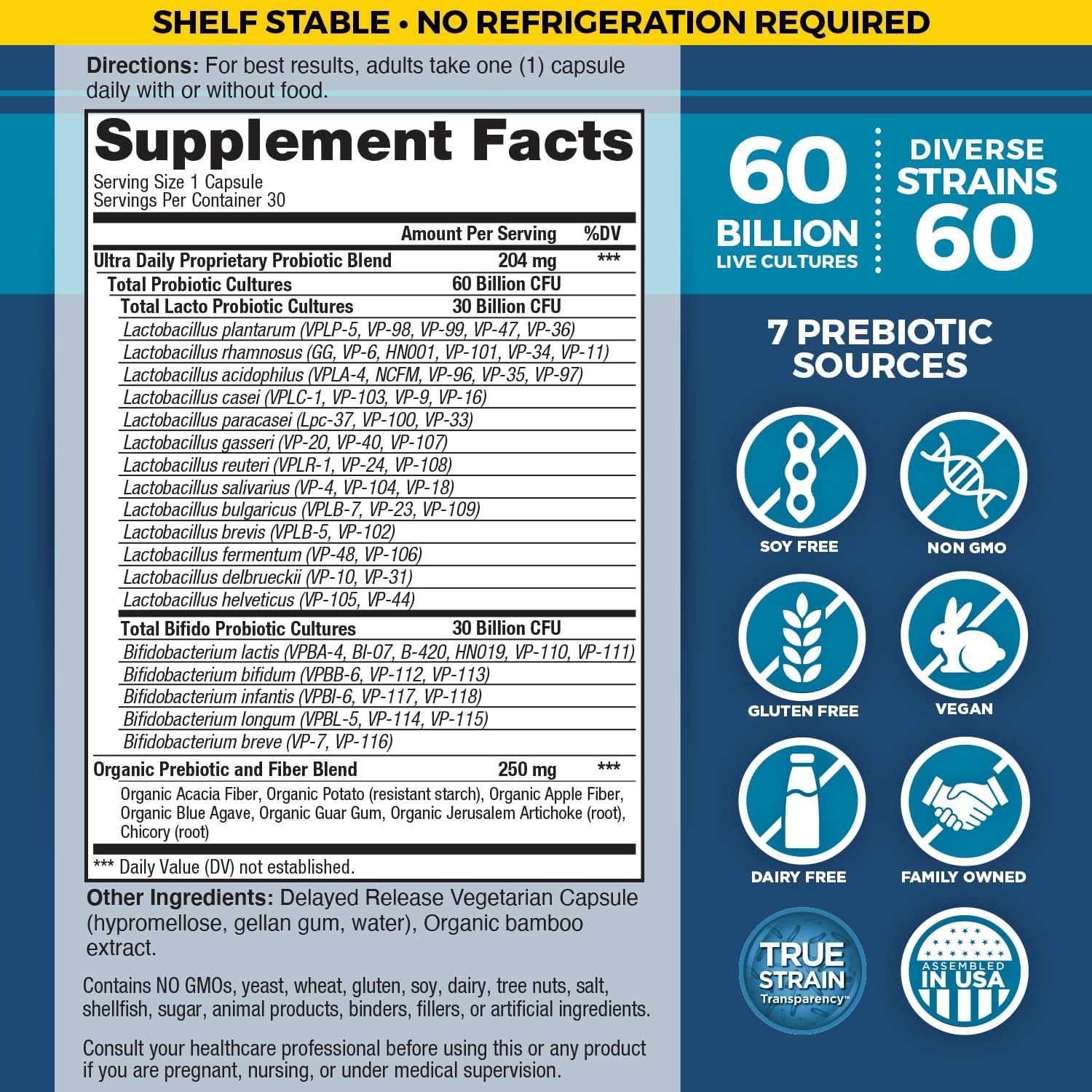 Premium Probiotic for Men and Women – Vital Flora Ultra Daily Probiotic is a high quality, potent one-capsule-a-day formula with 60 Billion live cultures (CFU) from 60 beneficial, clinically-studied Bifido and Lacto strains plus 7 organic prebiotics. Our optimally balanced, complete daily probiotic is formulated to general gut and immune health including occasional digestive discomforts like constipation, gas and bloating.