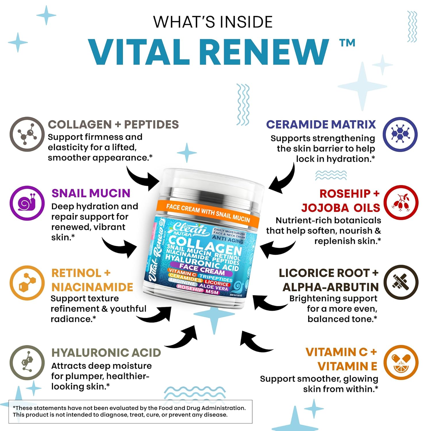 Vital Renew by Clean Nutra face cream for women and mens face moisturizer delivers more than the average korean moisturizer, face serum or neck cream, it provides all the support you need for an effortlessly radiant look. With niacinamide moisturizer, peptide serum, retinol moisturizer, mucin, glycerin face moisturizer, hyaluronic acid moisturizer, snail mucin face moisturizer, vitamin c moisturizer, aloe vera face moisturizer, peptide face moisturizer, licorice root face cream, and retinol cream for face, its lightweight formula swiftly absorbs, leaving behind a supple, more hydrated, and smoother skin. Tripeptide cream, ceramides moisturizer, licorice root extract for skin, arginine moisturizer, vitamin c face moisturizer, aloe vera moisturizer, peptide face cream, arginine face cream, aloe supplement, and msm moisturizer cocoons skin in moisture so you experience deep lasting hydration. Whether you’re searching for a face moisturizer for aging skin, lotion for extremely dry skin, night cream, neck creams for tightening and firming, or a daily moisturizer for face you can get all the benefits in one, making your daily routine easier. Tripeptide moisturizer, ceramides night cream, and collagen peptides powder support fuller naturally looking luminously radiant skin while snail moisturizer repairs and smooths for a flawless appearance. It’s time to embrace a skincare routine that truly cares for your skin and start incorporating Clean Nutraceuticals’ Vital Renew into your daily routine for adiate luminosity.