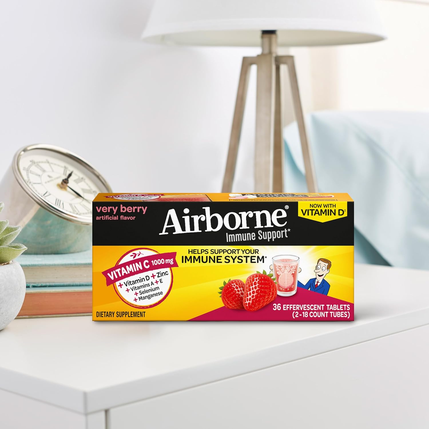 Airborne immune support effervescent tablets are packed with 1000mg Vitamin C per serving, which helps support your immune system.* These Vitamin C with Zinc effervescent tablets contain 73% of your daily value of Zinc, which plays a central role in your immune system and is essential for the functioning and signaling of immune cells.* Airborne immune support tablets contains the powerful antioxidants Vitamin A (to support immune health), Vit C (to support immune health) and Vitamin E (to help fight free radicals).* This crafted blend of 13 immune support vitamins, minerals & herbs is an excellent source of Zinc and Selenium. Airborne is the #1 Immune Support Gummy, Effervescent & Chewable Brand.1 Don’t take our word for it, check out our 5-star rating and read our customer reviews. These refreshing, Very Berry flavored, dissolvable Vitamin C tablets are convenient and easy for adults and for kids 12+ to take at home or on the go. Drop one (1) tablet into 4-6 ounces of water, let dissolve and drink. *These statements have not been evaluated by the Food and Drug Administration. This product is not intended to diagnose, treat, cure or prevent any disease. 1Based on unit sales L52W through 10/30/2021