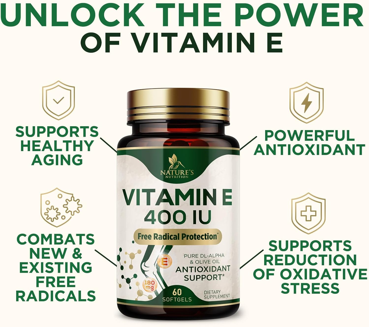 dl-ALPHA FOR SKIN HEALTH SUPPORT: Vitamin E is known for its skin-nourishing properties; These Vitamin E 400 IU softgels can help support a glowing complexion and appearance of fine lines and wrinkles, making it an excellent addition to your skincare routine