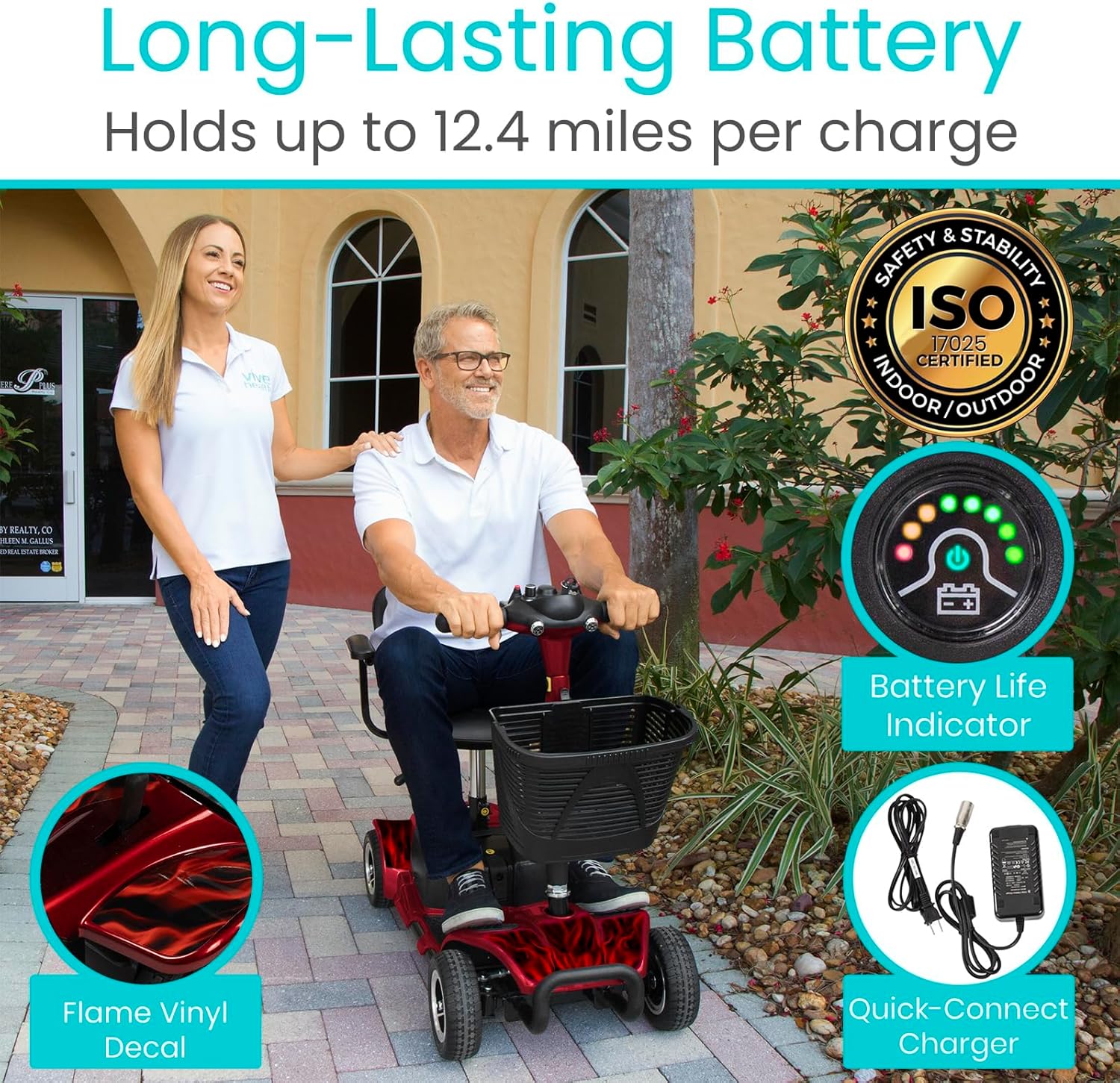 SAFELY NAVIGATE SMOOTH SURFACES: Easily maneuver over smooth indoor surfaces and rough outdoor surface with the Vive 4-Wheel Mobility Scooter—with comfort and ease. Designed to safely support up to 265 pounds, the mobility scooter and its tires were engineered for durability and safety. Its easy-grip tires are flat-free, non-marking, and are 8”. Its maximum speed is 3.7 mph, and it has a driving distance up to 12.4 miles per charge.