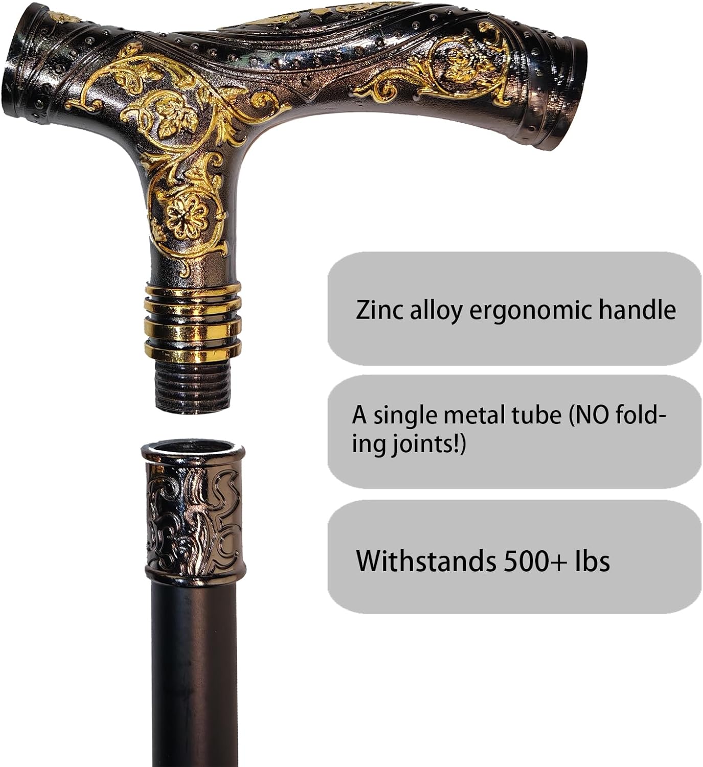【Unbreakable Stability】 This isn’t just a walking cane – it’s a statement of strength and style. Designed for discerning users who refuse to settle for flimsy canes, our all-metal construction delivers unparalleled durability. Crafted from a single solid metal tube (NO folding joints!) and solid zinc alloy handle, this cane withstands 500+ lbs with zero wobble. No rust, no creaks, no loose parts–ever.
