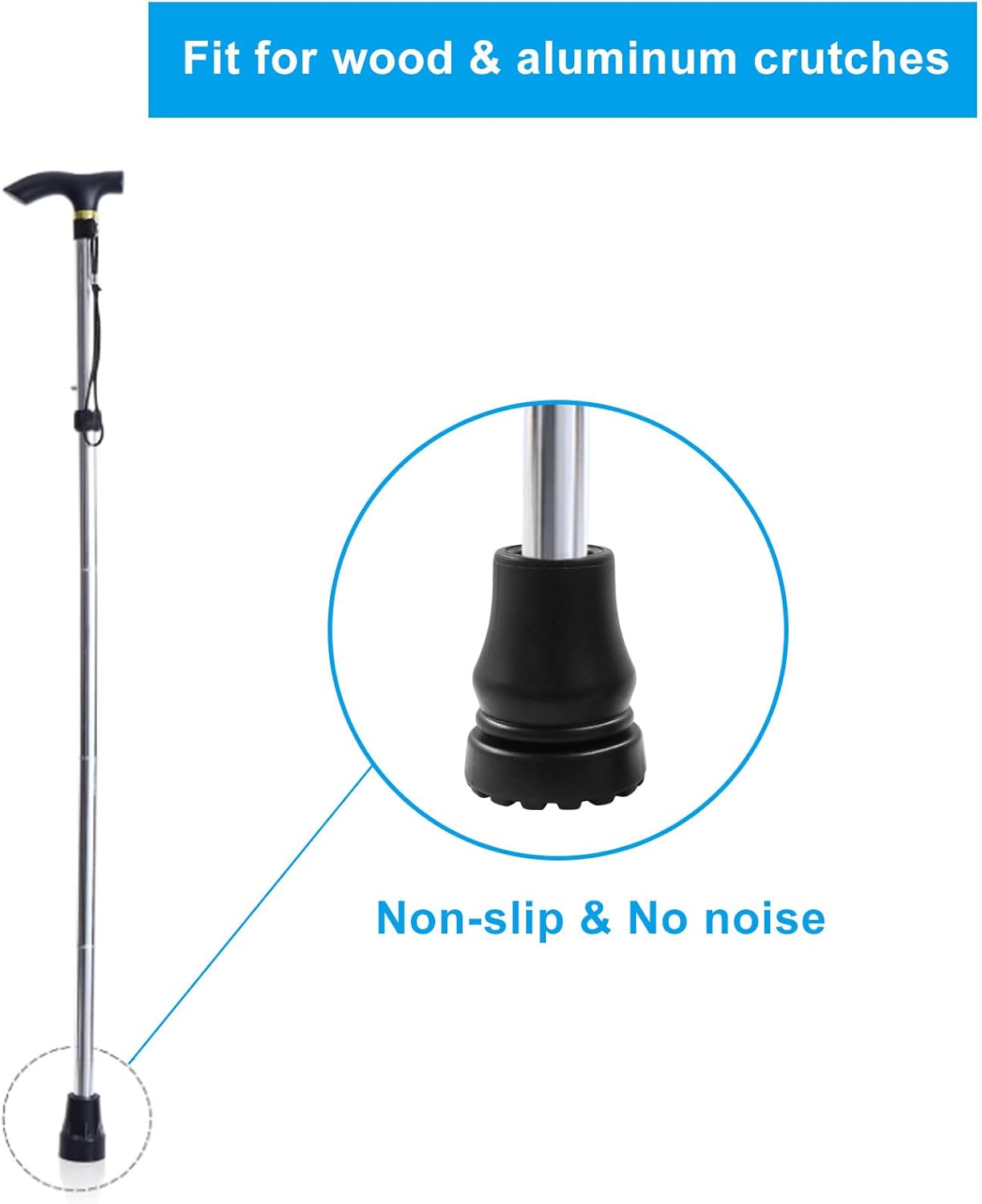 Our rubber crutches have excellent tip construction and are perfect for 5/8, 3/4, 7/8 inch crutches, as well as most aluminum and wooden crutches. The ultra wide rubber feet of the cane provide additional traction when walking on rough roads or loose terrain such as grass, gravel, soil, or sand