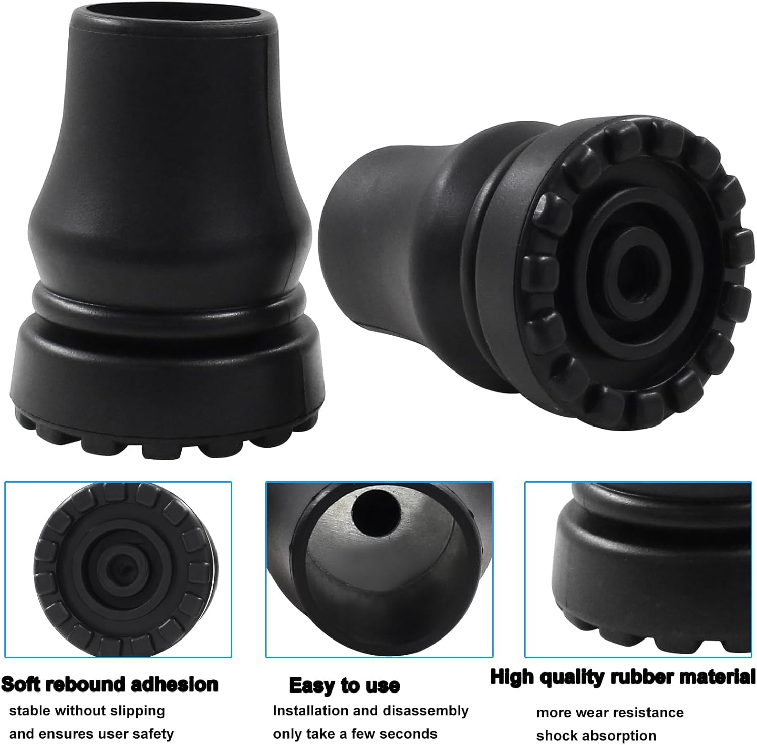 Sturdy quality: The rubber cane tips with a good rubber tip provides additional stability, good traction, slip resistance, shock absorption, and sturdiness.