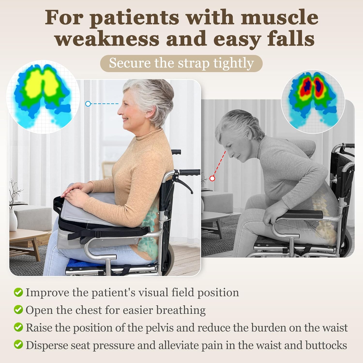 【More stable】: Multiple anti-slip points at the bottom of the pillow ensure a stable fixation during use and reduce the risk of sliding; equipped with two fixed on the armrests to prevent the patient from leaning forward. Please note! Be sure to tighten the fixing straps.