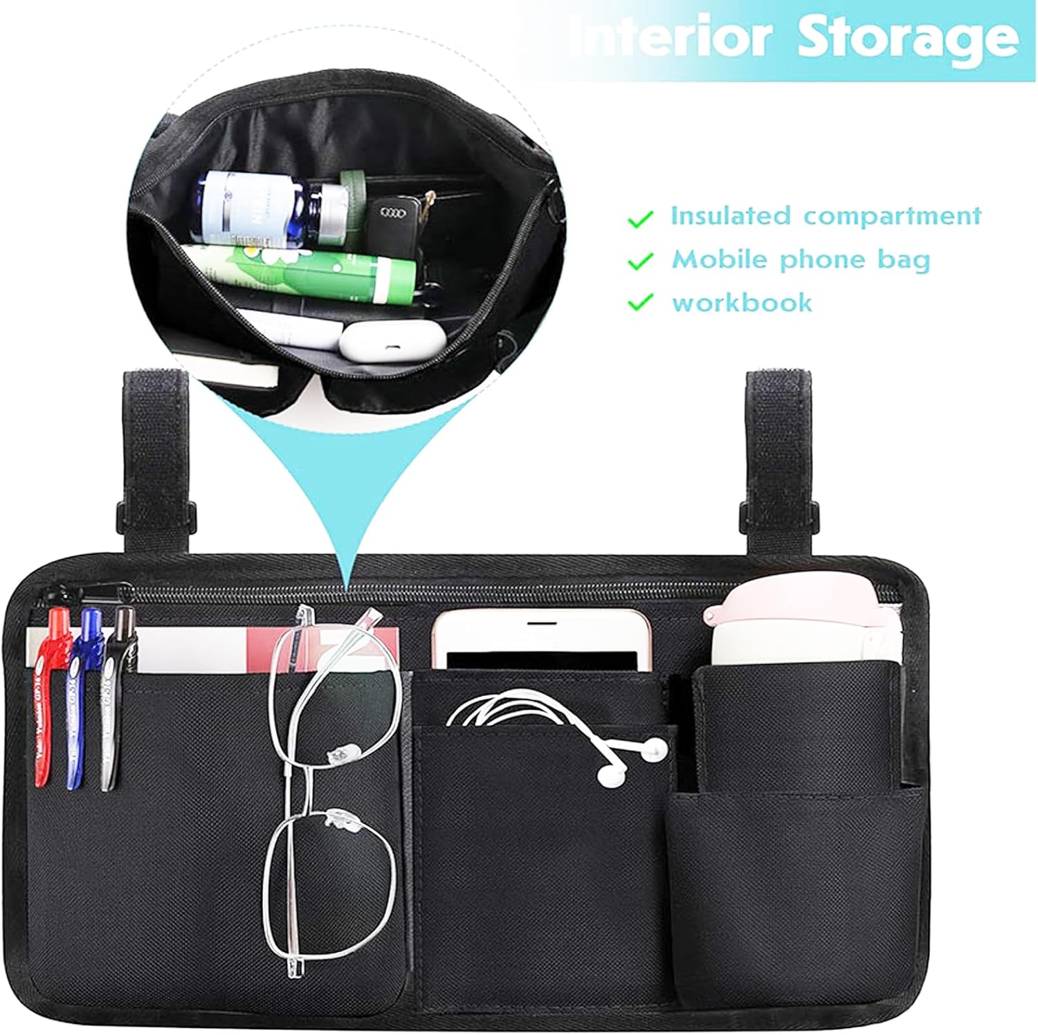 UNIVERSAL FIT FOR MOBILITY DEVICES:Adjustable straps attach securely to wheelchairs (electric/standard), walkers, rollators, and scooters. Mount inside or outside armrests without obstructing movement.