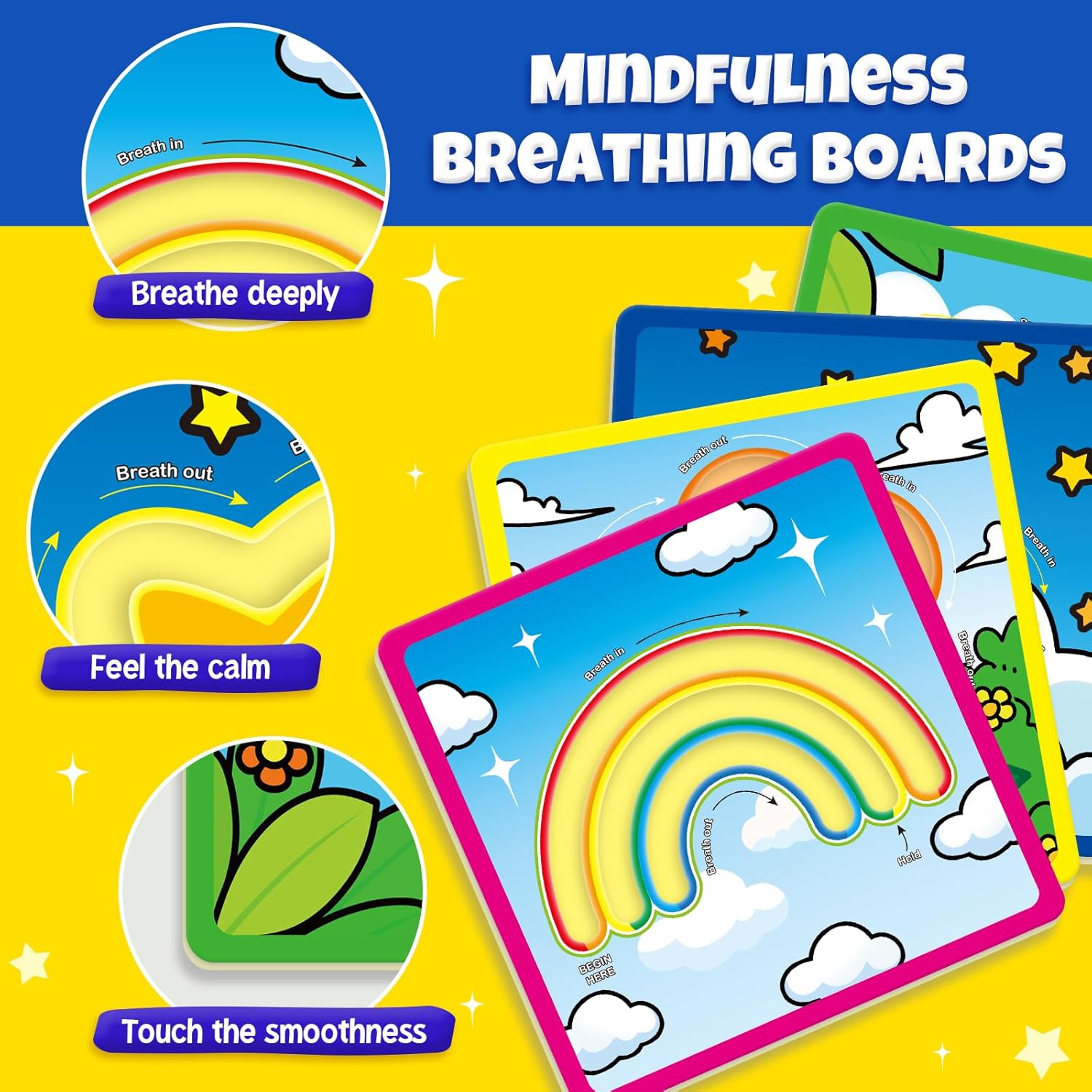 Simple to Use: Choose a board, follow the path with your finger. Breathe in and out according to the visual breathing cues on the board to help calm your body and mind.