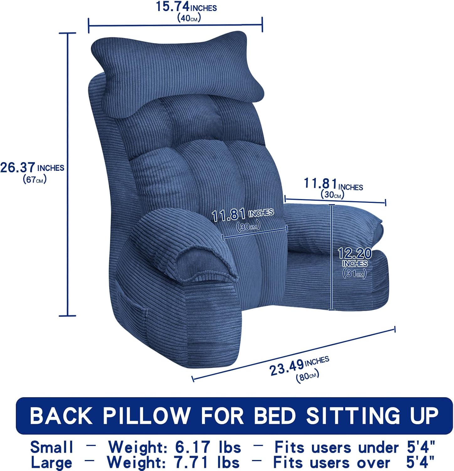 Back pillow for bed sitting up: This reading pillow is 26.37 inches in height and 31.49 inches in width, offering solid back support. Each armrest extends 11.81 inches, and the height has been upgraded to 12.20 inches. This bed reading pillow can help relieve back fatigue while relaxing and provides additional support for your arms, making reading more comfortable. Recommended weight range: 462 lbs (smaller builds) / 528 lbs (larger builds). Exceeding this range may affect performance and is not advised