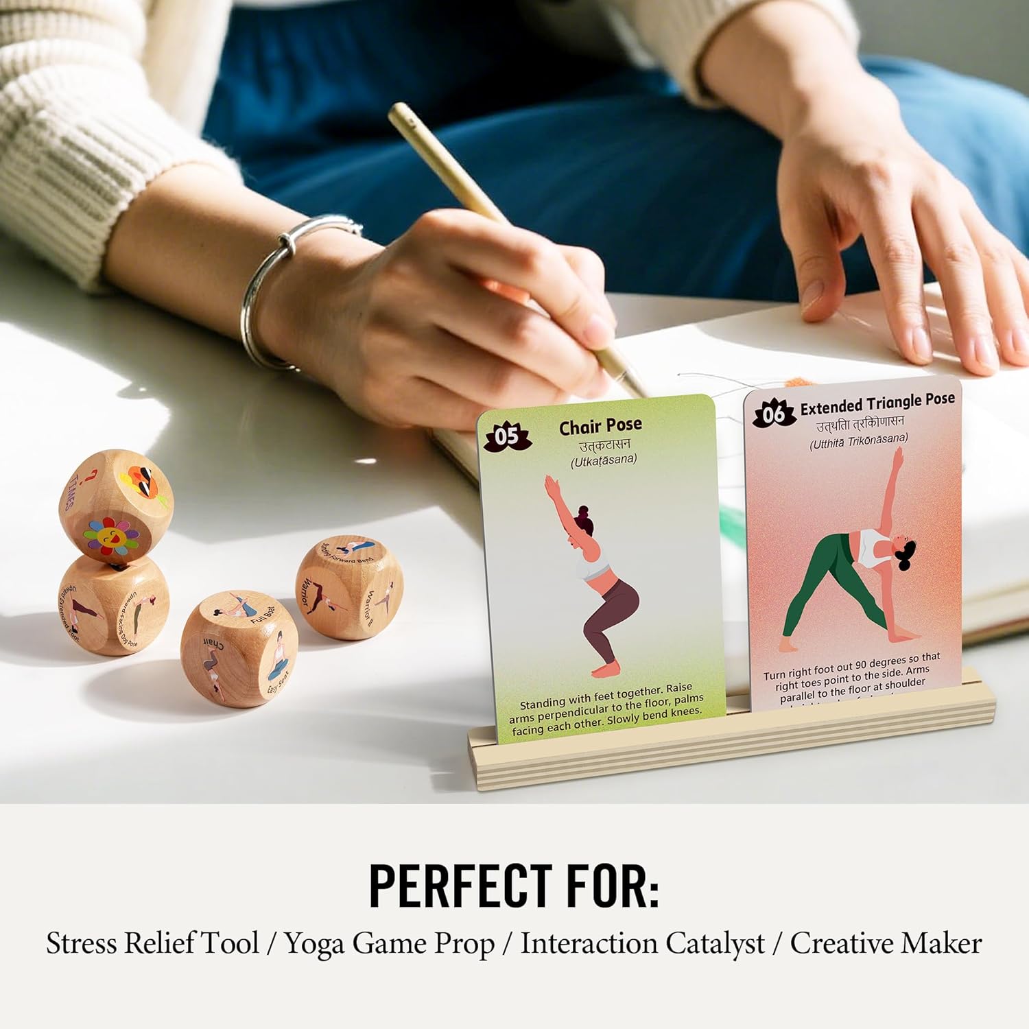 2. HIGH-QUALITY – Made from solid wood, these dice and holders are more durable and long-lasting than paper or foam alternatives and have no unpleasant odor. Our yoga sequence cards are made of cardstock material with high rigidity.
