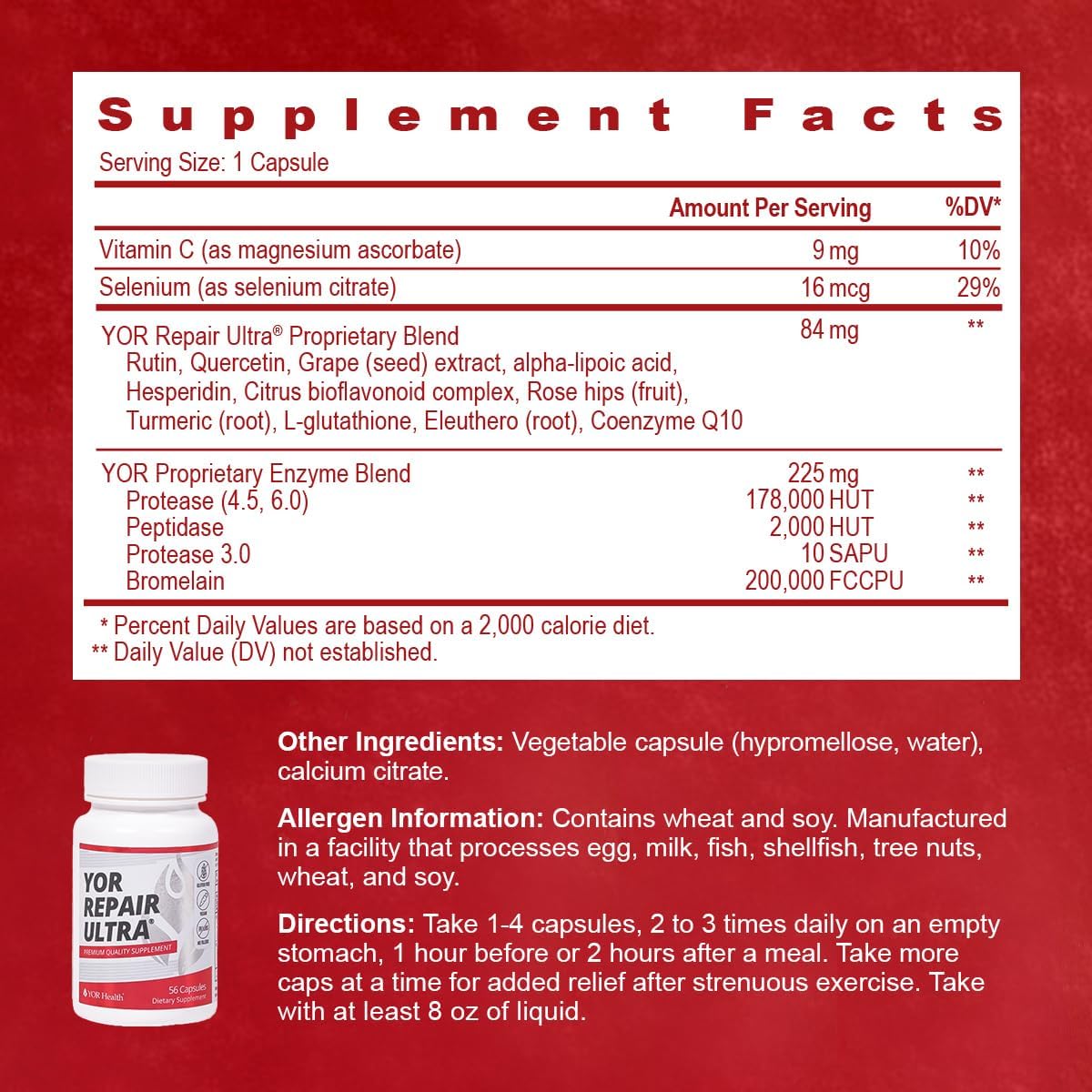 YOR Repair Ultra is a powerful muscle, tissue and joint recovery system that combines clinically tested proteolytic enzymes, potent antioxidants, vitamins, minerals, and herbs to help accelerate your body’s natural repair process. Our proprietary enzyme blend works to support the body’s natural, healthy inflammatory response. By helping to clear excess fibrin & metabolic byproducts while promoting microcirculation, these targeted enzymes support muscle, tissue, and joint repair. This enzymatic action ensures other vital nutrients and oxygen reach tissues more efficiently, allowing you to recover faster and reclaim comfortable movement every single day.