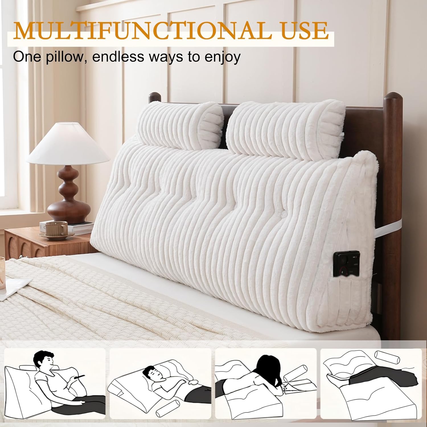【Soft Long Plush Fabric – Cozy & Skin-Friendly】This wedge headboard pillow is crafted with premium long plush fabric, offering a warmer, softer, and more skin-friendly touch than ordinary plush pillows.The velvety texture offers a cozy, relaxing touch that elevates your comfort during reading, lounging, or watching TV.
