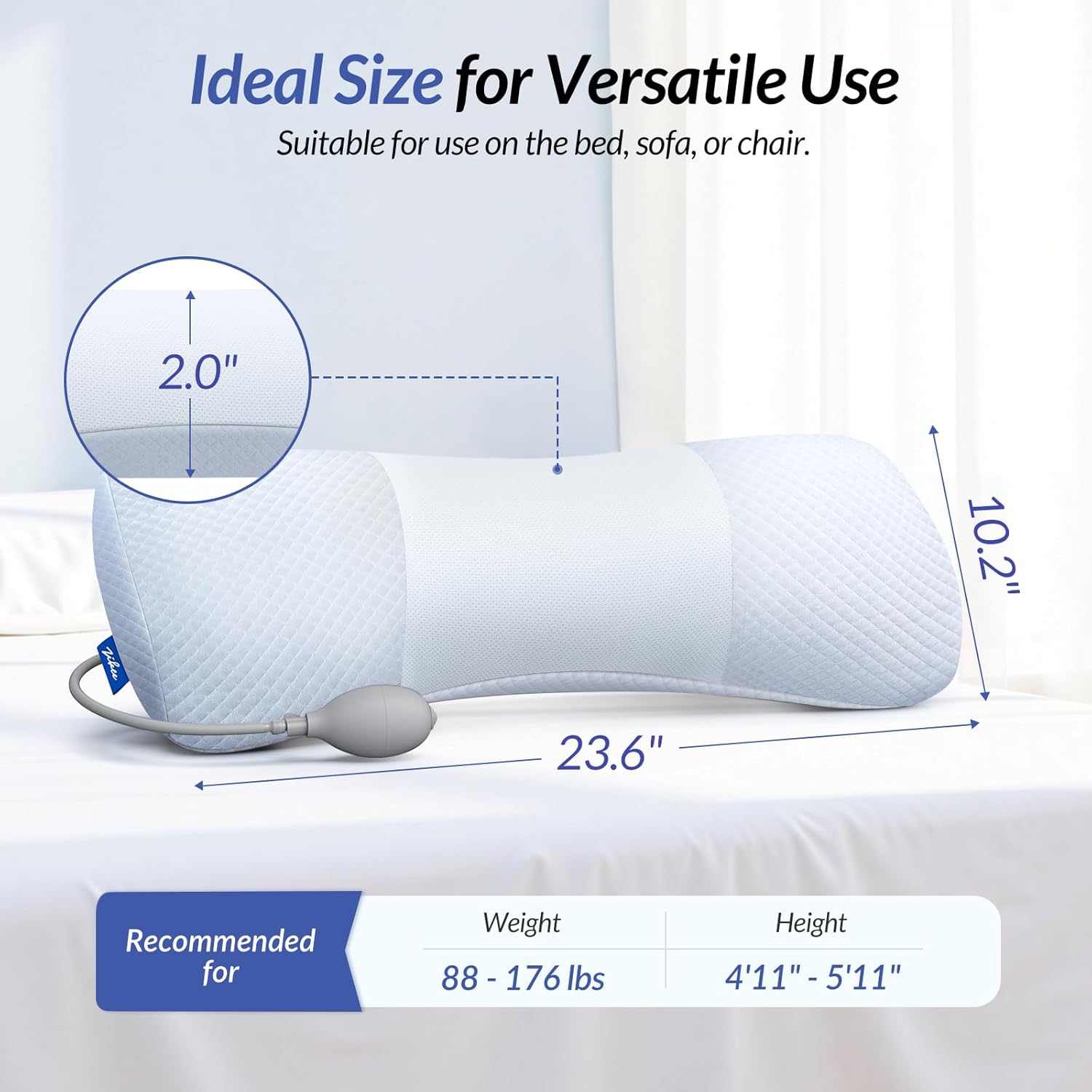Inflatable Pillow for Personalized Lower Back Pain Relief: This back pillow features a built-in inflatable airbag, which allows height adjustment from 1.8″ to 3.7″ to provide personalized support and maintain natural spinal alignment, relieving pain and discomfort. Additionally, its extended side wings provide wider support that hugs your waist. Ideal for back, side sleeping and sitting support